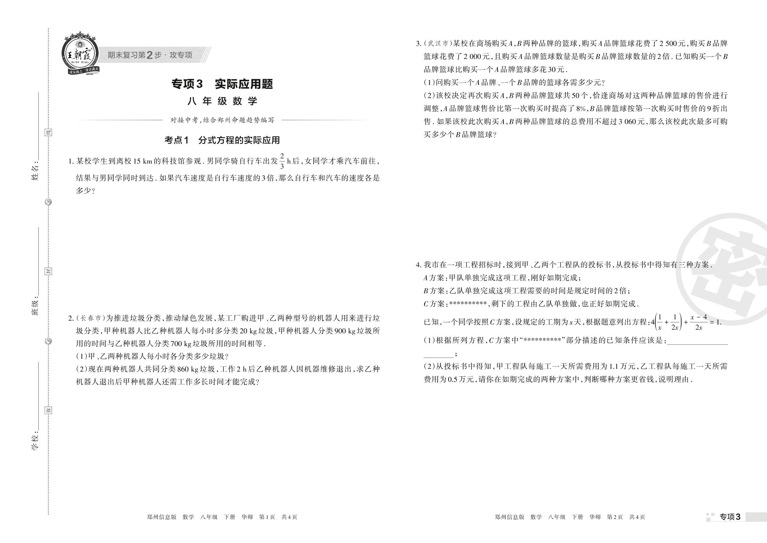 王朝霞期末专项卷——实际应用题八年级下册数学(华师版)【3】