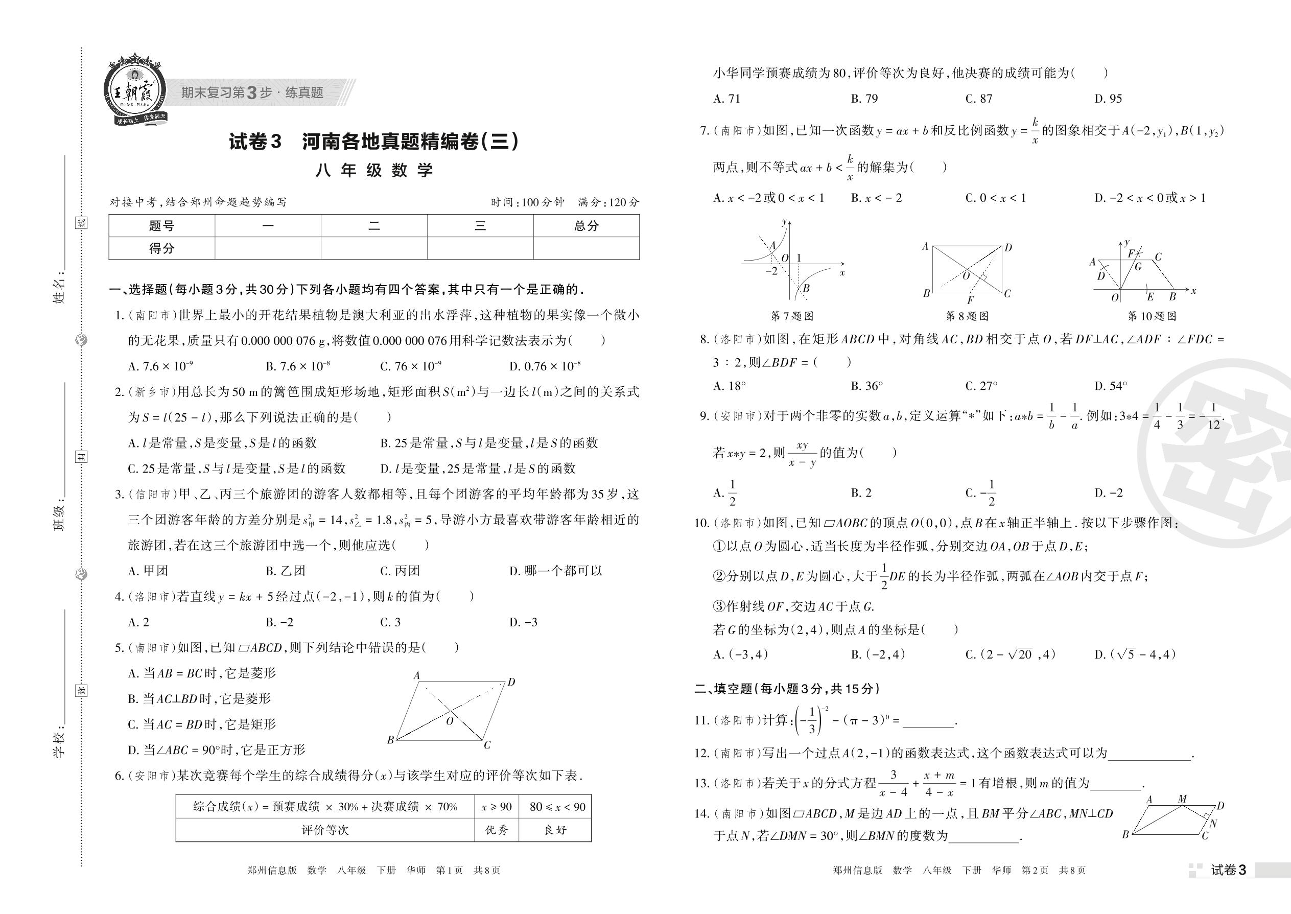 河南各地真题精编卷(三)八年级下册数学(华师版)【3】