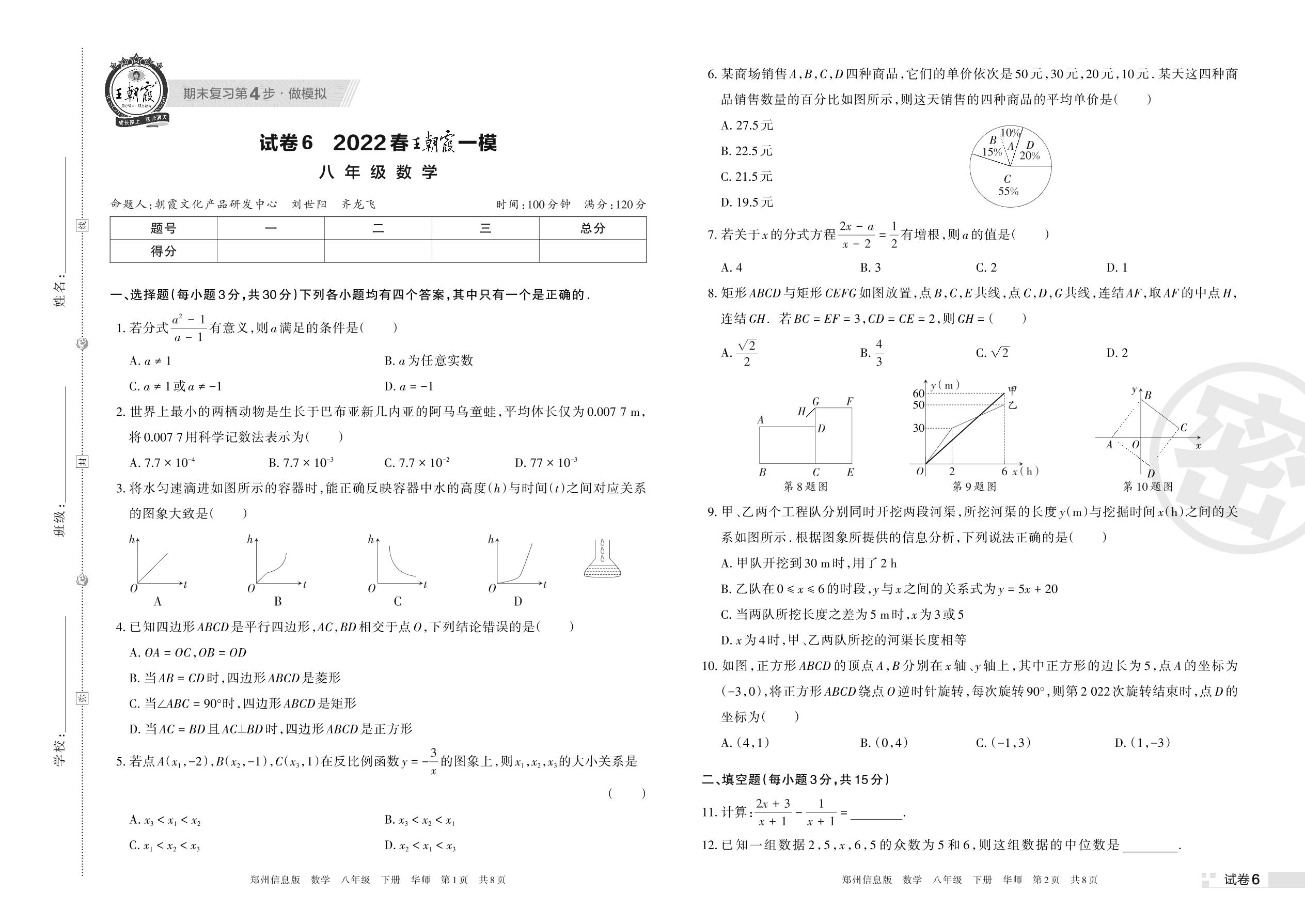 王朝霞期末模拟卷八年级下册数学(华师版)【6】