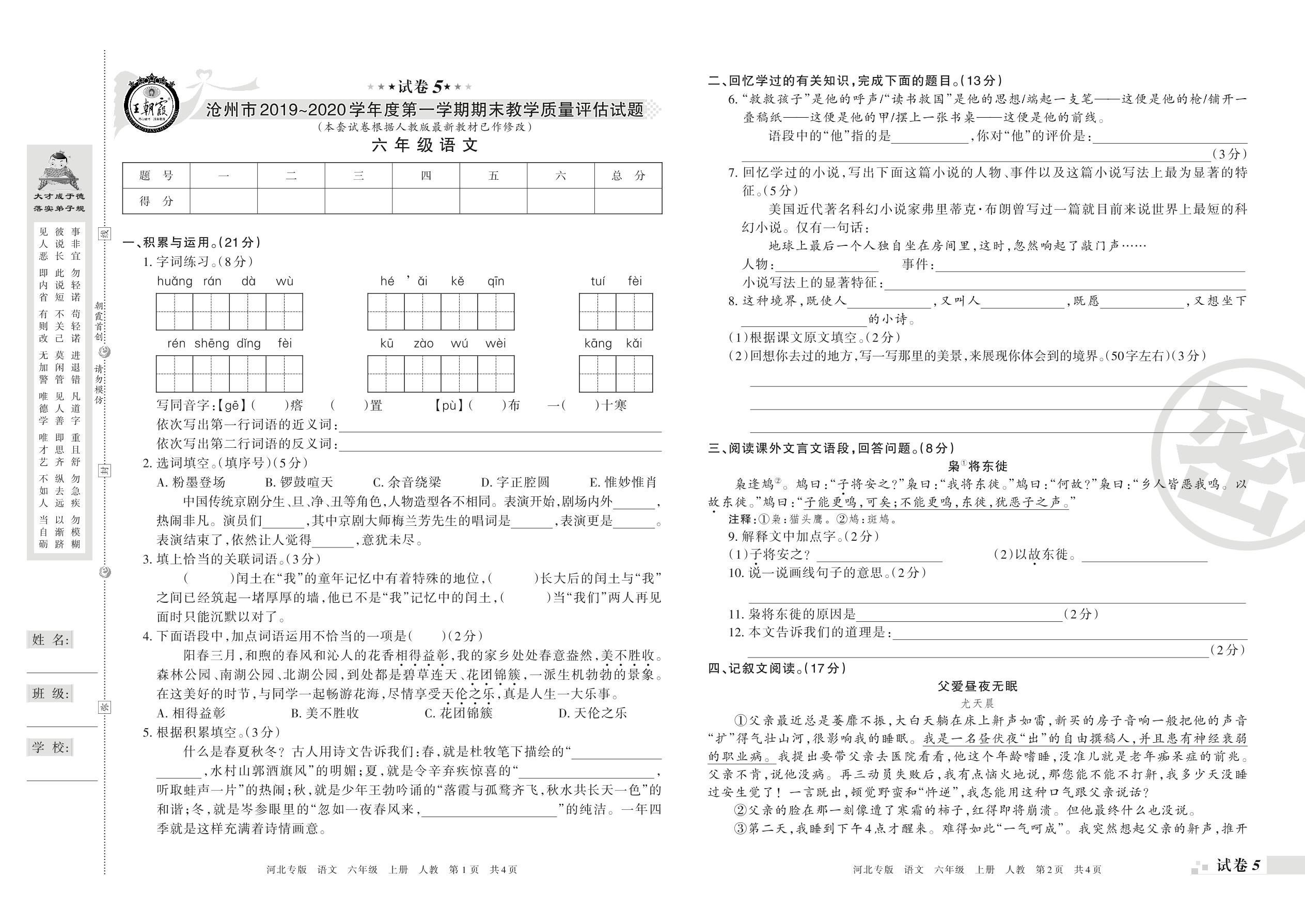 2019-2020学年第一学期沧州市六年级语文试卷(人教版)【5】