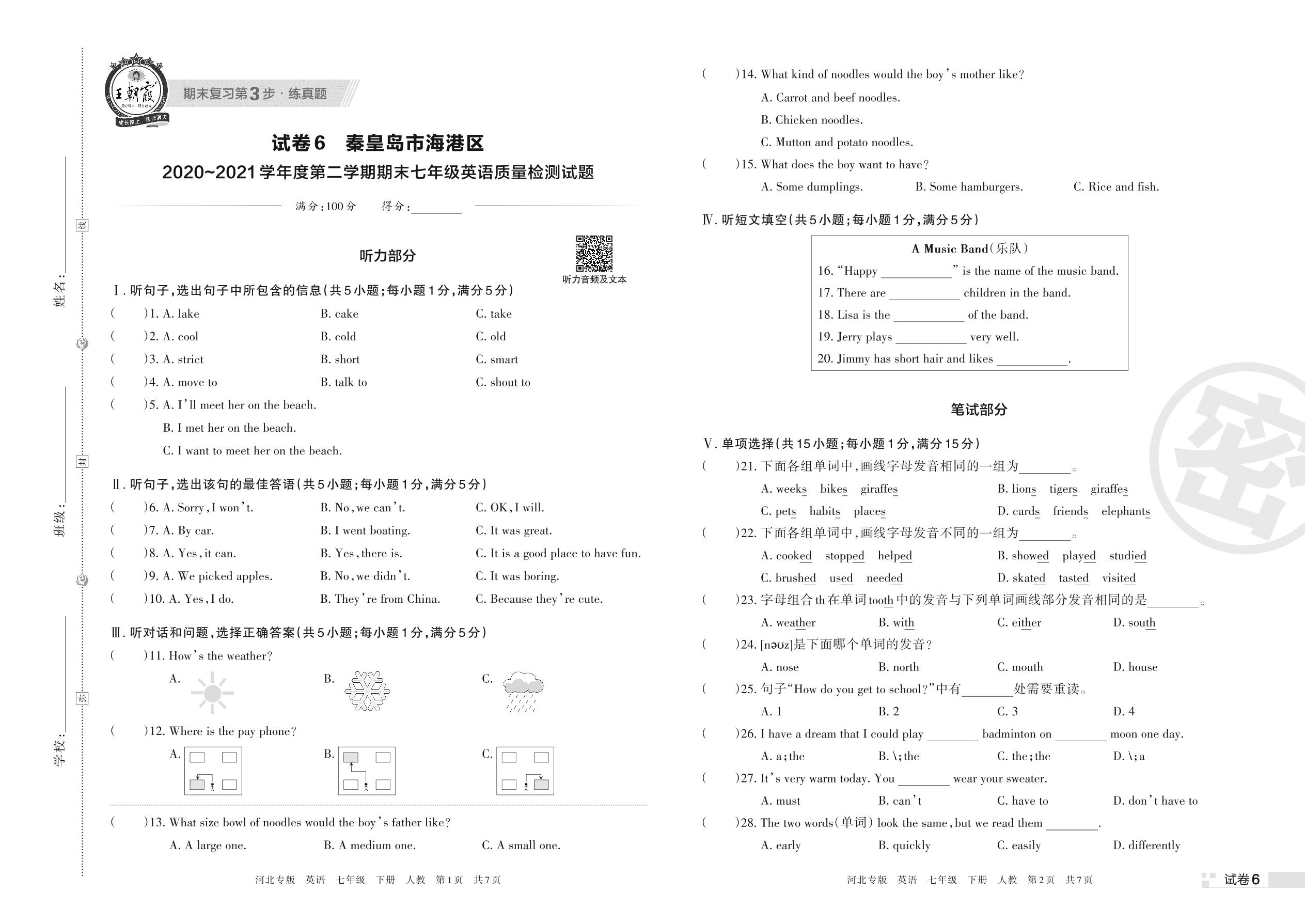 秦皇岛市海港区2020~2021学年度第二学期期末七年级英语质量检测试题(人教版)【6】