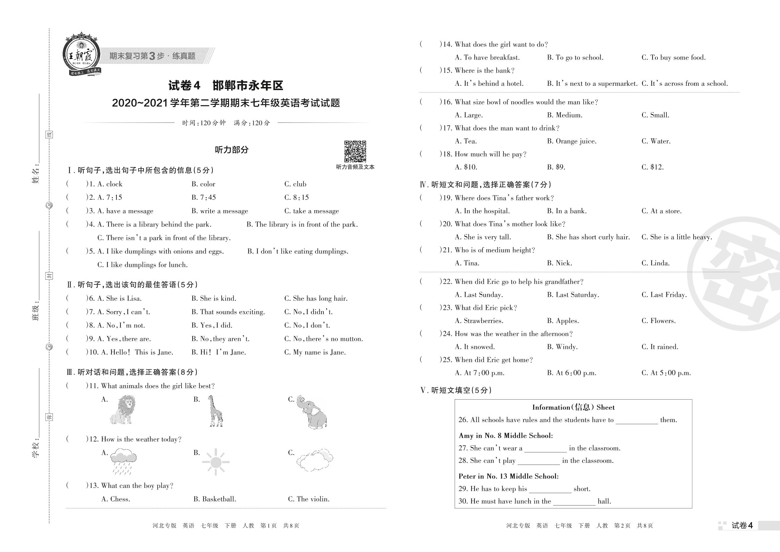邯郸市永年区2020~2021学年第二学期期末七年级英语考试试题(人教版)【4】