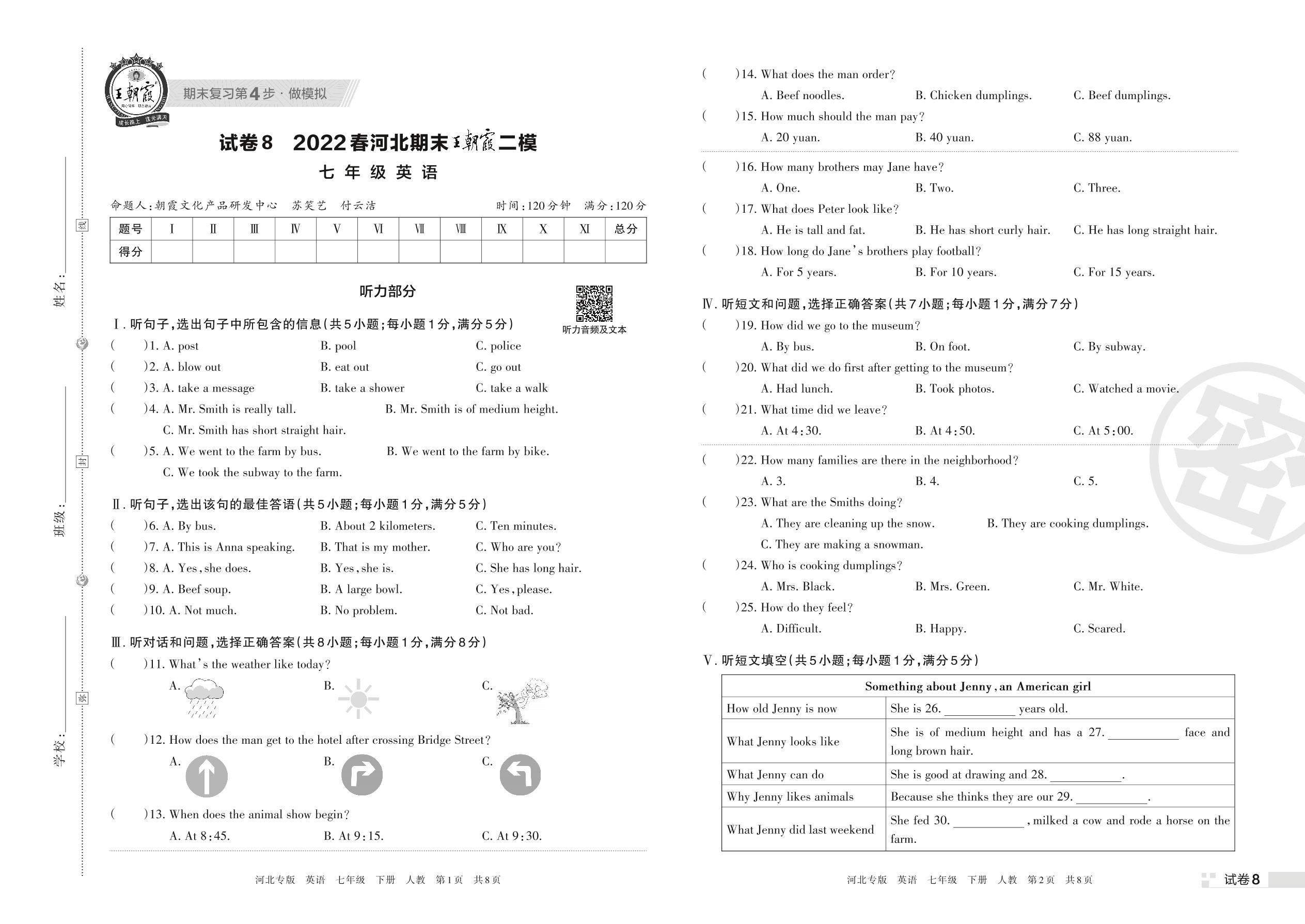 王朝霞期末模拟卷七年级下册英语(人教版)【8】