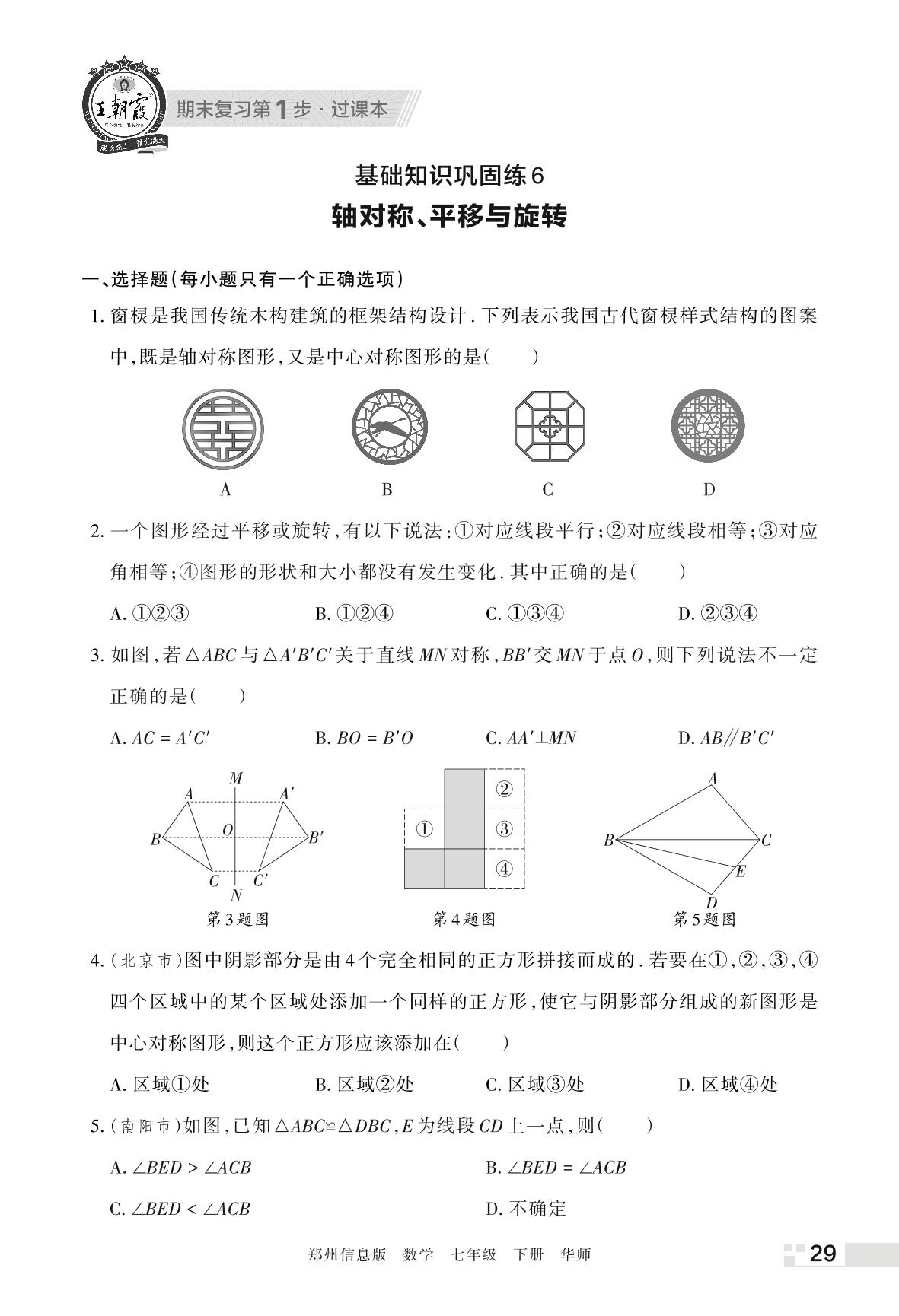 王朝霞期末过课本——基础知识巩固练6 轴对称、平移与旋转七年级下册数学(华师版)