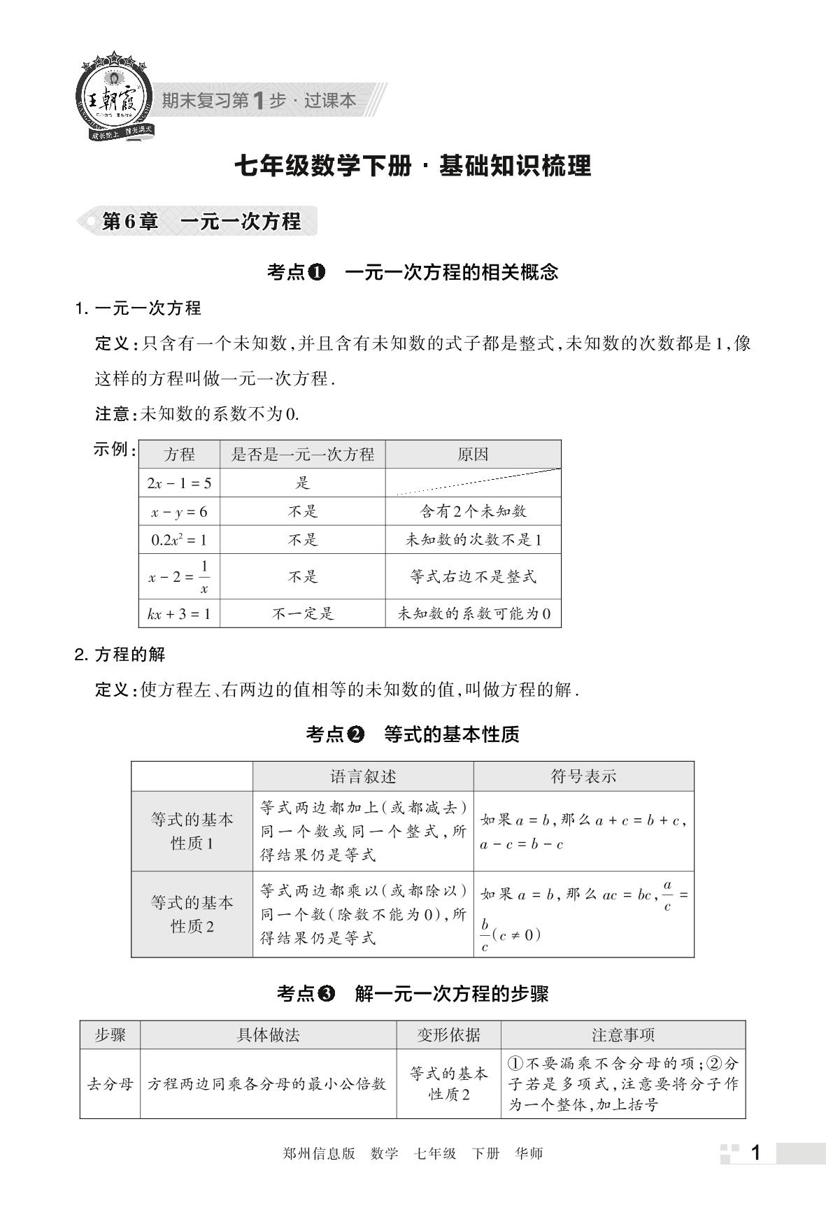 王朝霞期末过课本——基础知识梳理七年级下册数学(华师版)