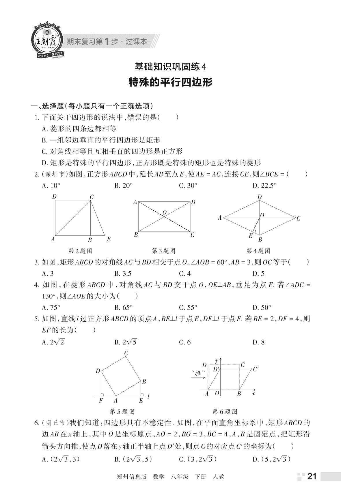 王朝霞期末过课本——基础知识巩固练4 特殊的平行四边形八年级下册数学(人教版)_R220322143819347