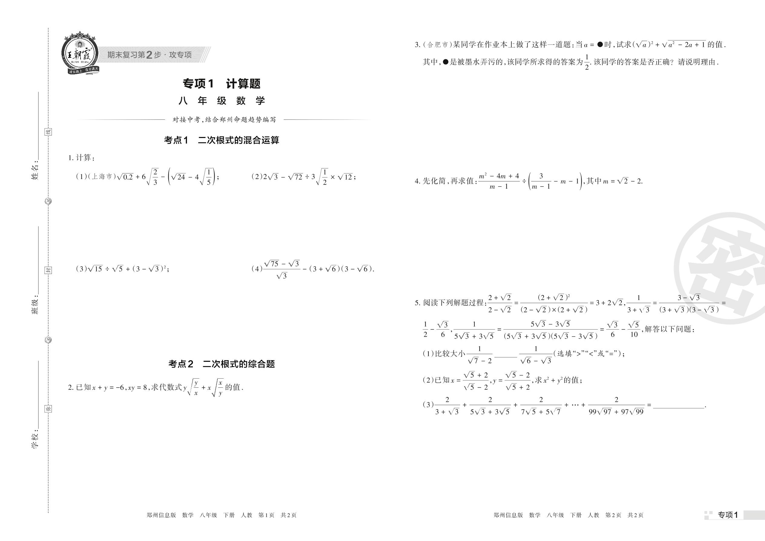 王朝霞期末专项卷——计算题八年级下册数学(人教版)_R220322143820734【1】