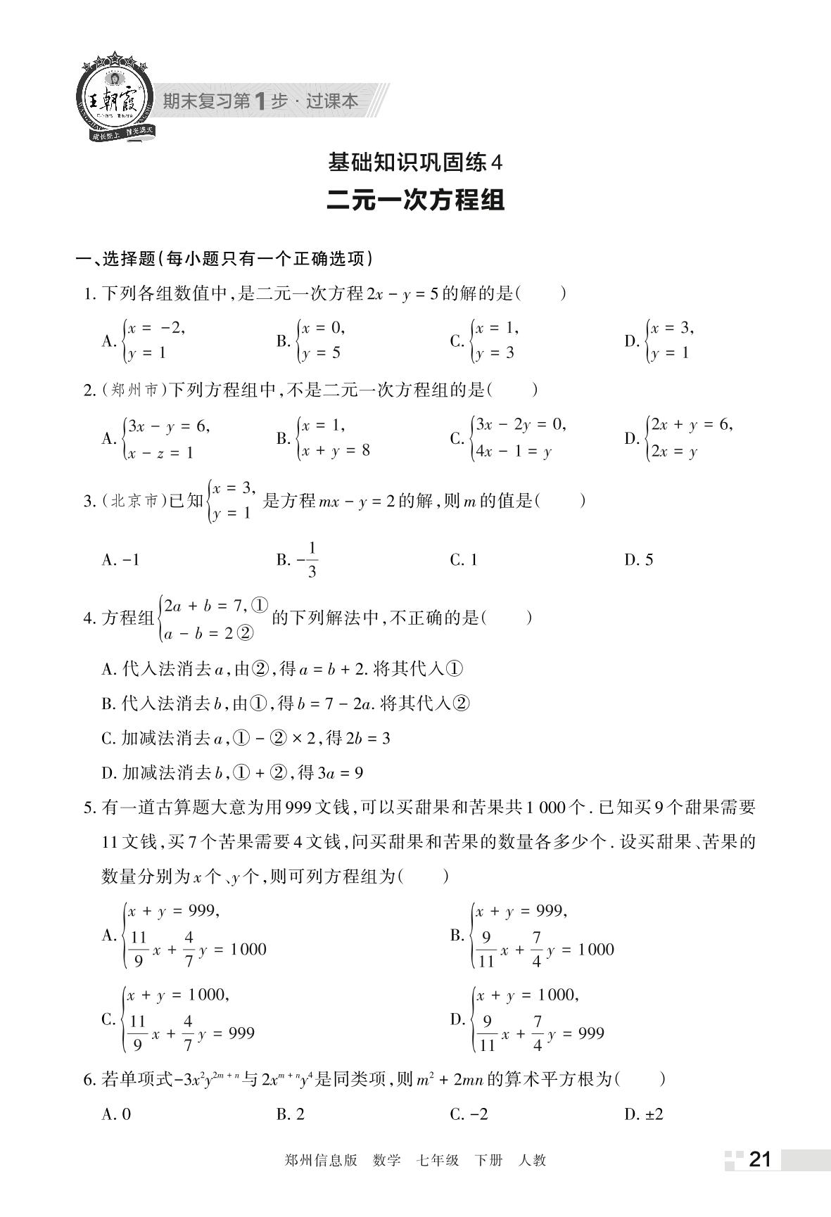 王朝霞期末过课本——基础知识巩固练4 二元一次方程组七年级下册数学(人教版)_R220322151435602