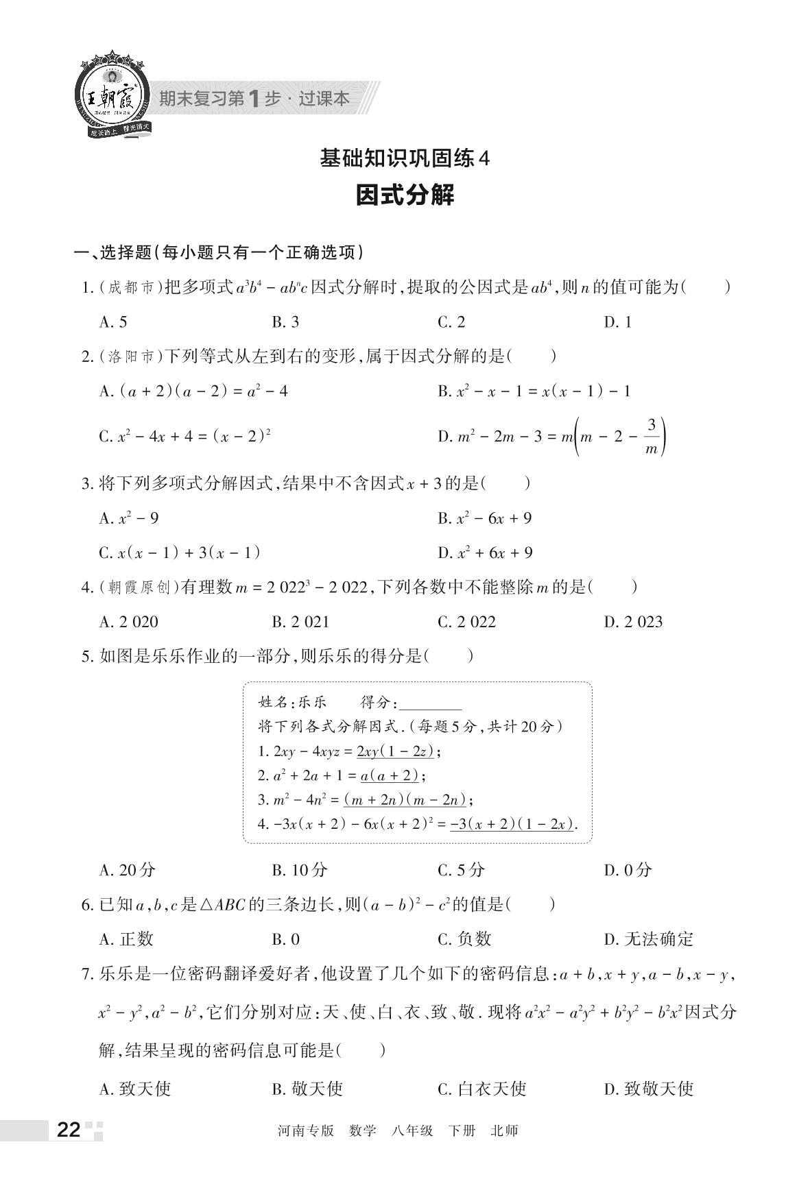 王朝霞期末过课本——基础知识巩固练4 因式分解八年级下册数学(北师版)_R220322165105227