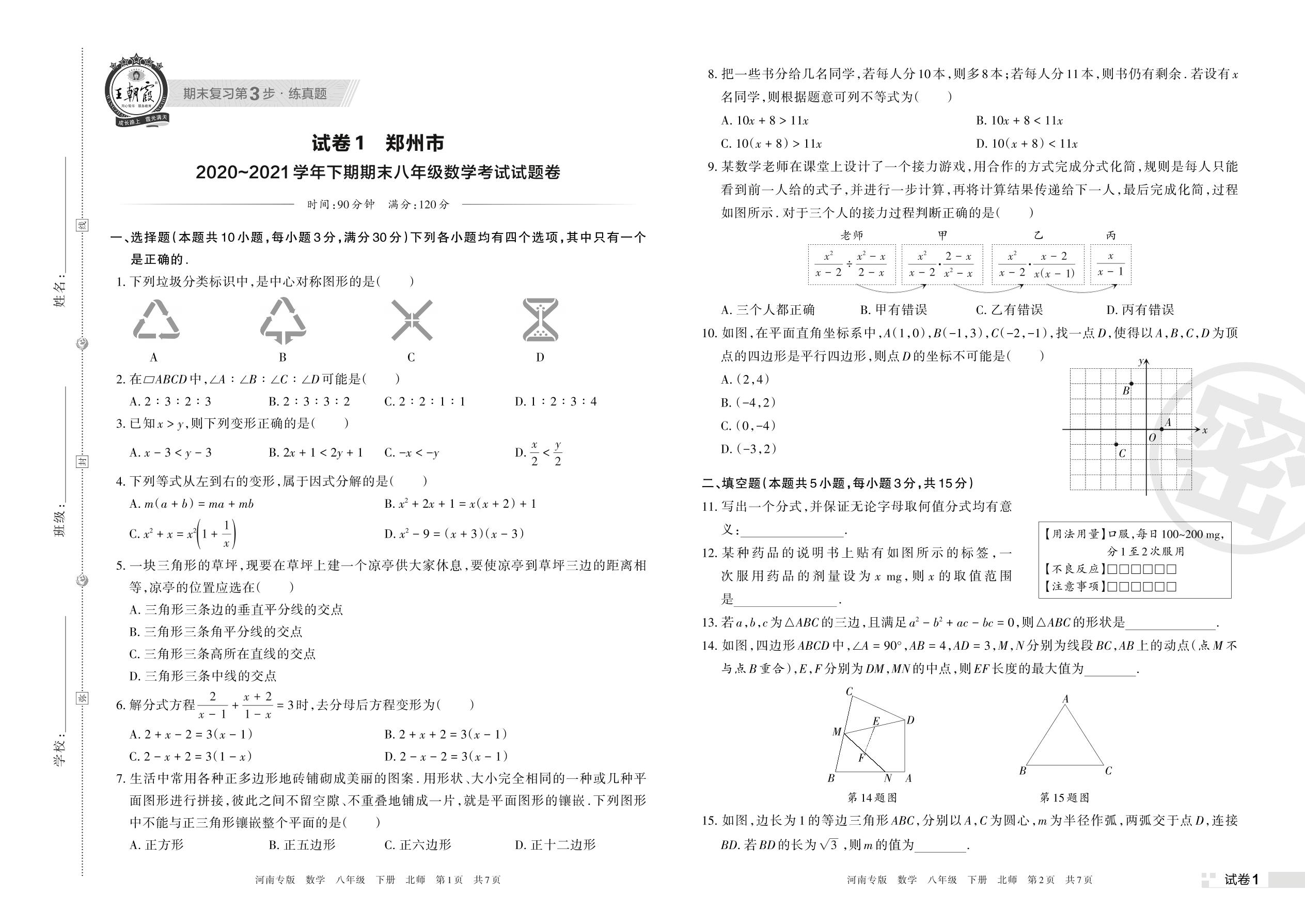 郑州市2020~2021学年下期期末八年级数学考试试题卷(北师版)【1】