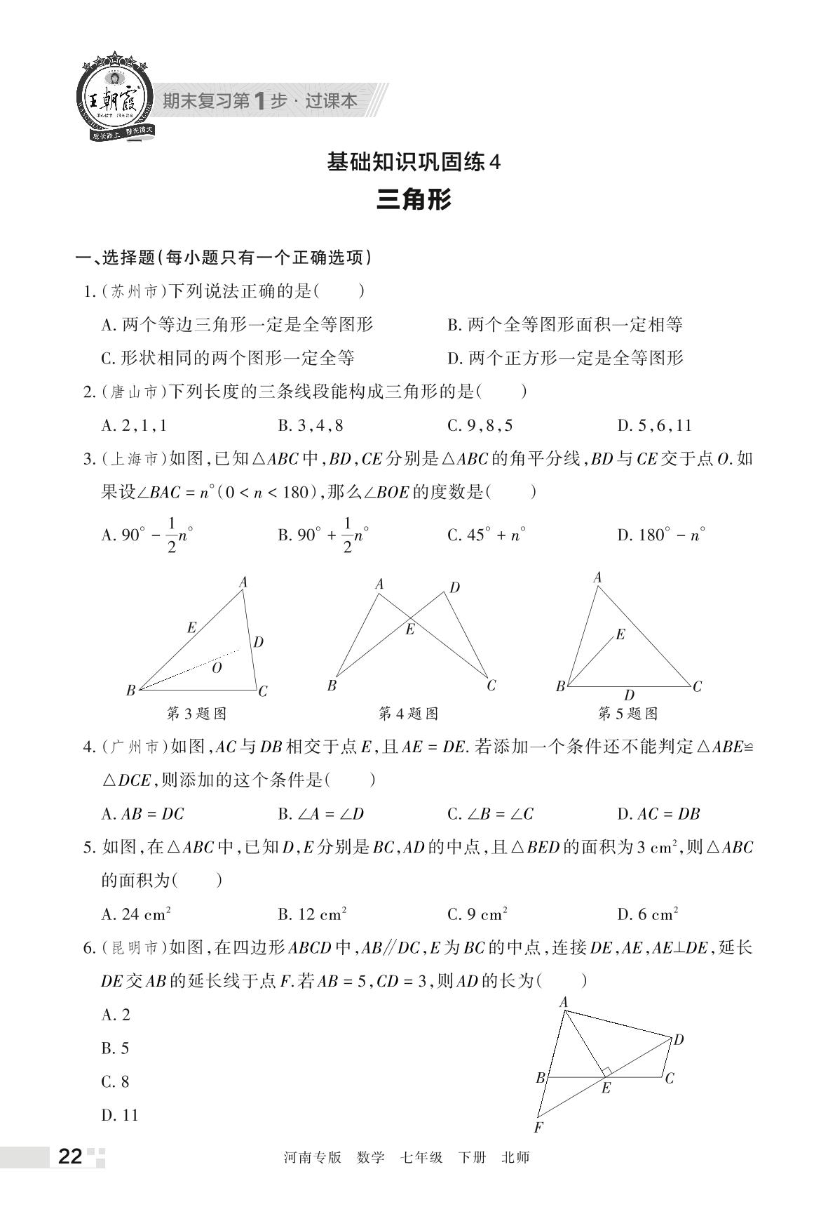王朝霞期末过课本——基础知识巩固练4 三角形七年级下册数学(北师版)_R220322170019753