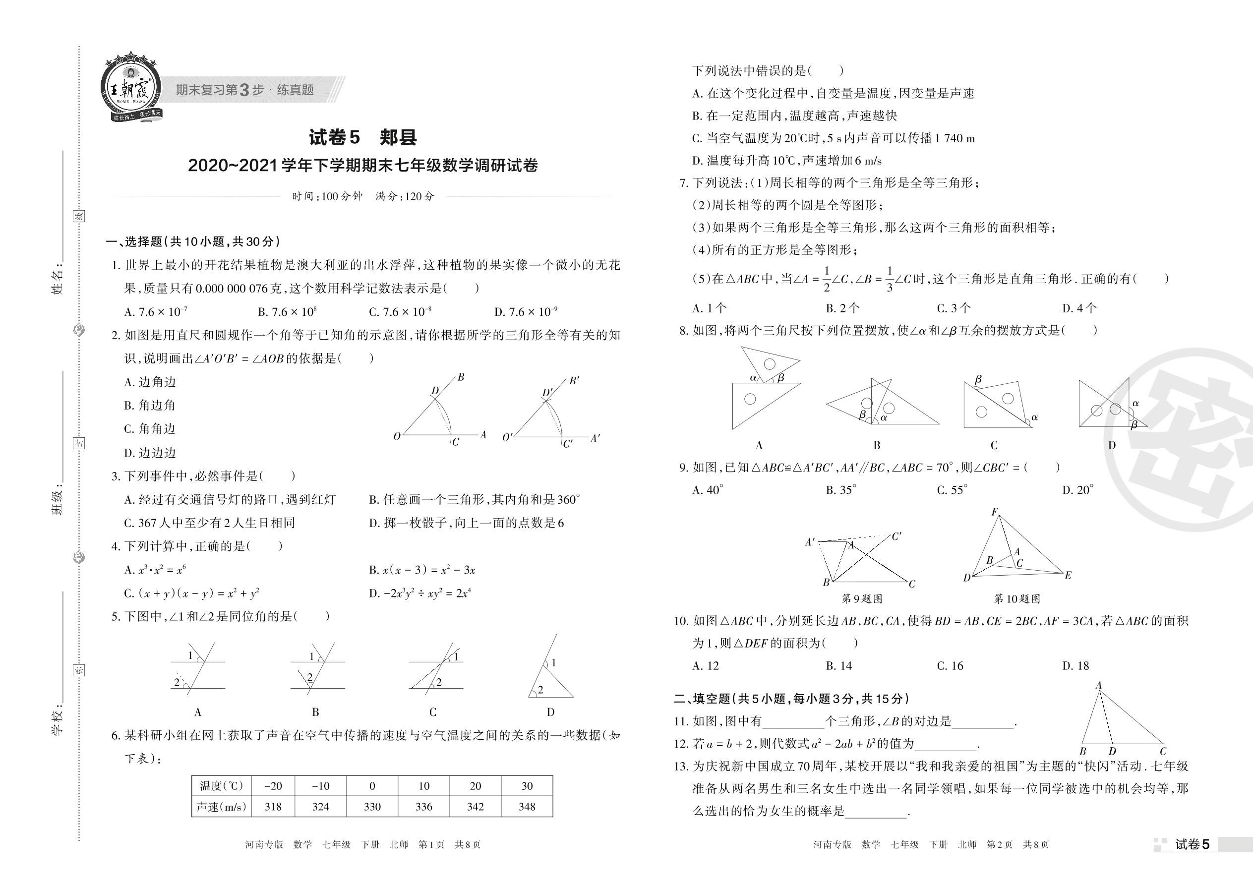 郏县2020~2021学年下学期期末七年级数学调研试卷(北师版)【5】