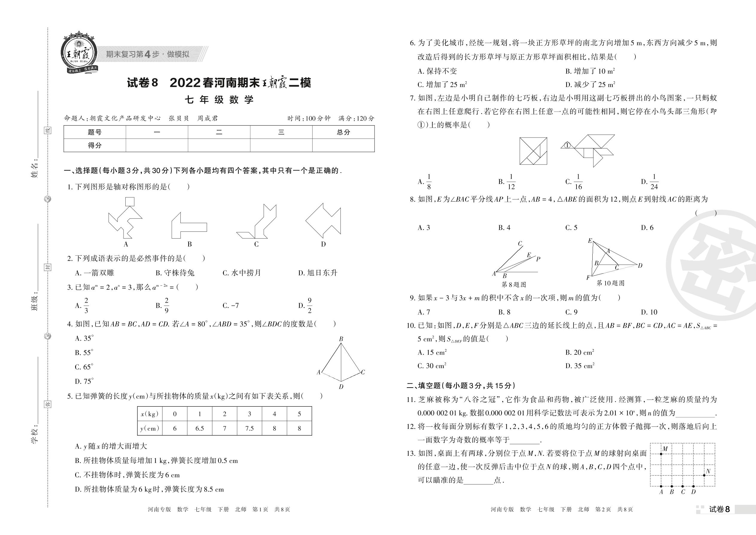 王朝霞期末模拟卷七年级下册数学(北师版)【8】
