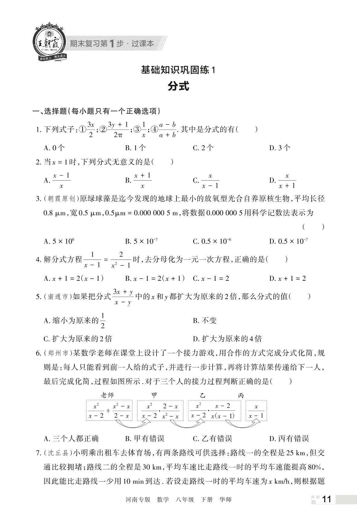 王朝霞期末过课本——基础知识巩固练1 分式八年级下册数学(华师版)_R220322170813870