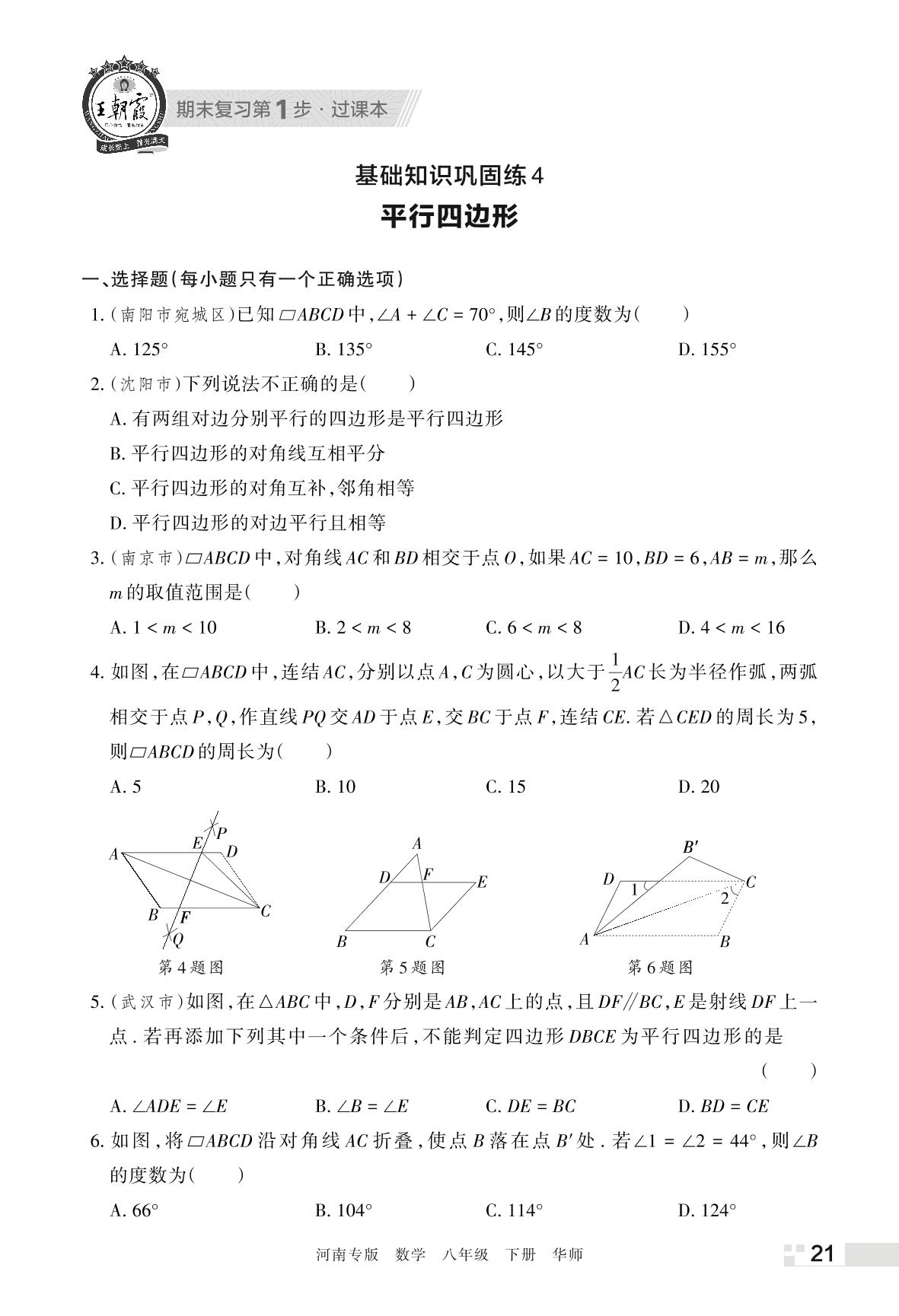 王朝霞期末过课本——基础知识巩固练4 平行四边形八年级下册数学(华师版)_R220322170813704
