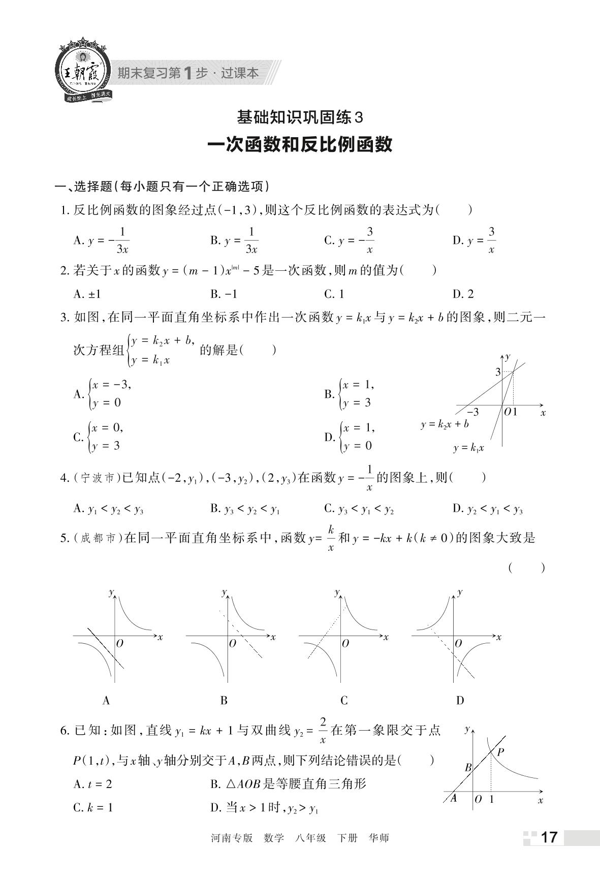 王朝霞期末过课本——基础知识巩固练3 一次函数和反比例函数八年级下册数学(华师版)_R220322170813131