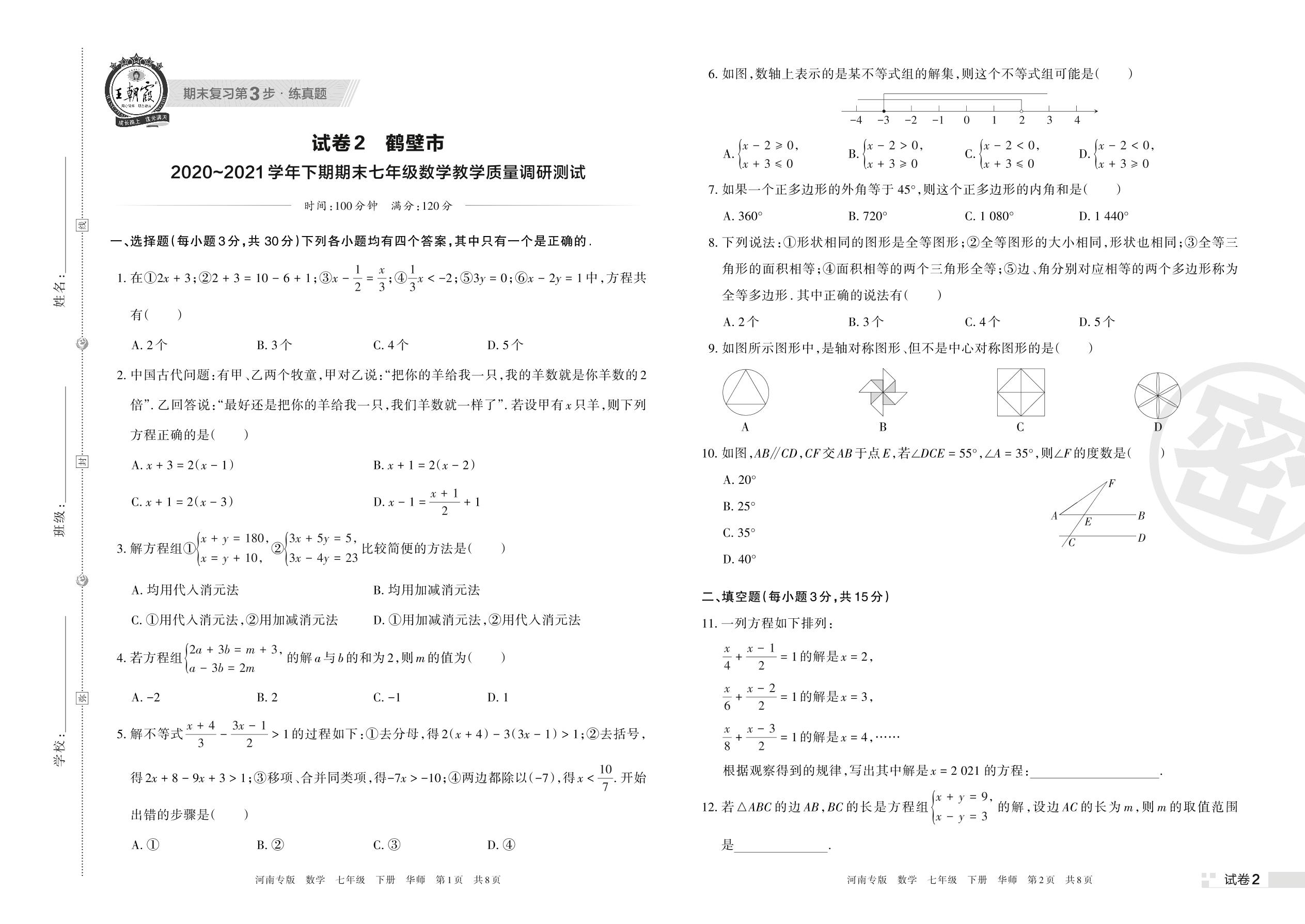 鹤壁市2020~2021学年下期期末七年级数学教学质量调研测试(华师版)【2】