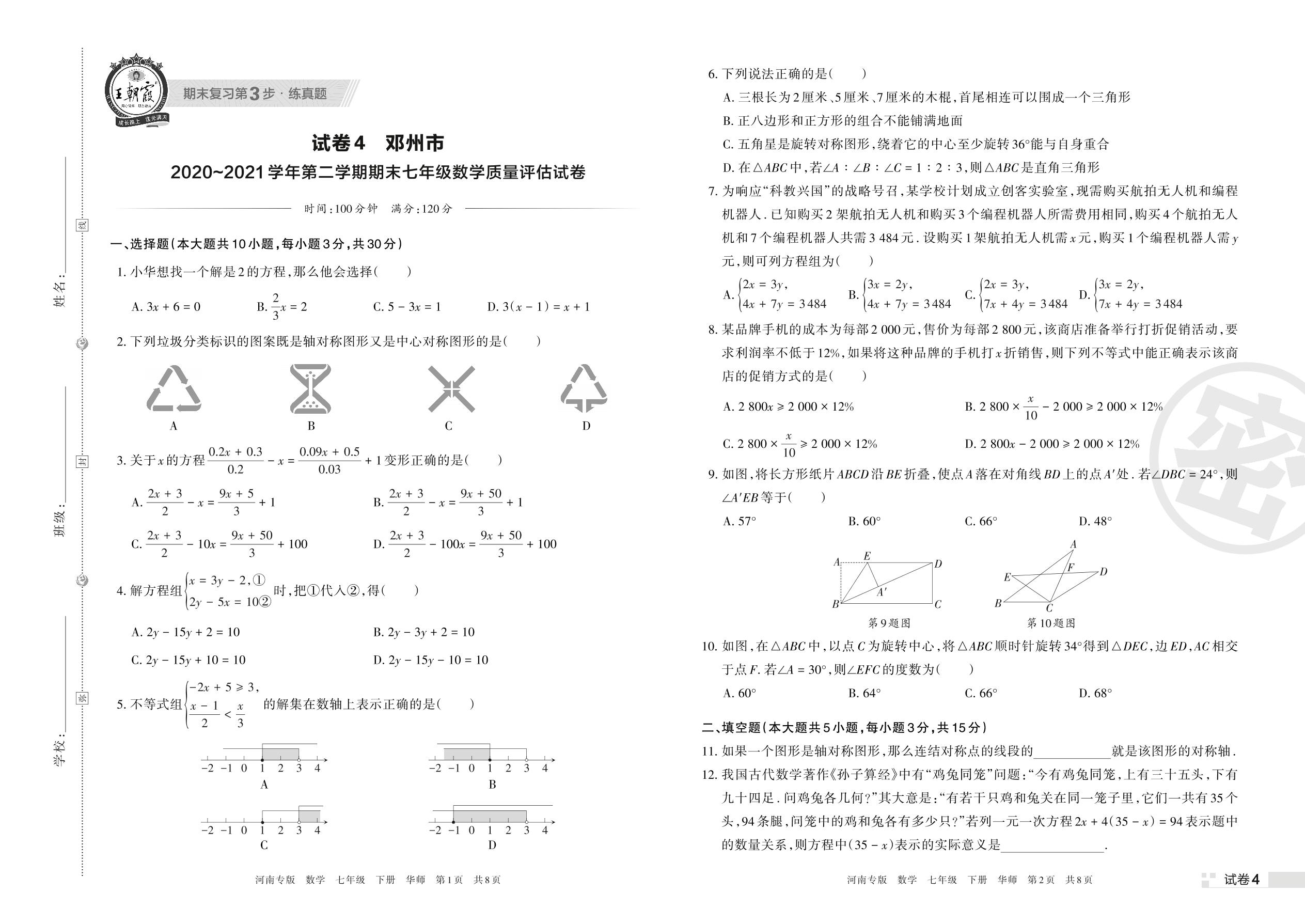 邓州市2020~2021学年第二学期期末七年级数学质量评估试卷(华师版)【4】