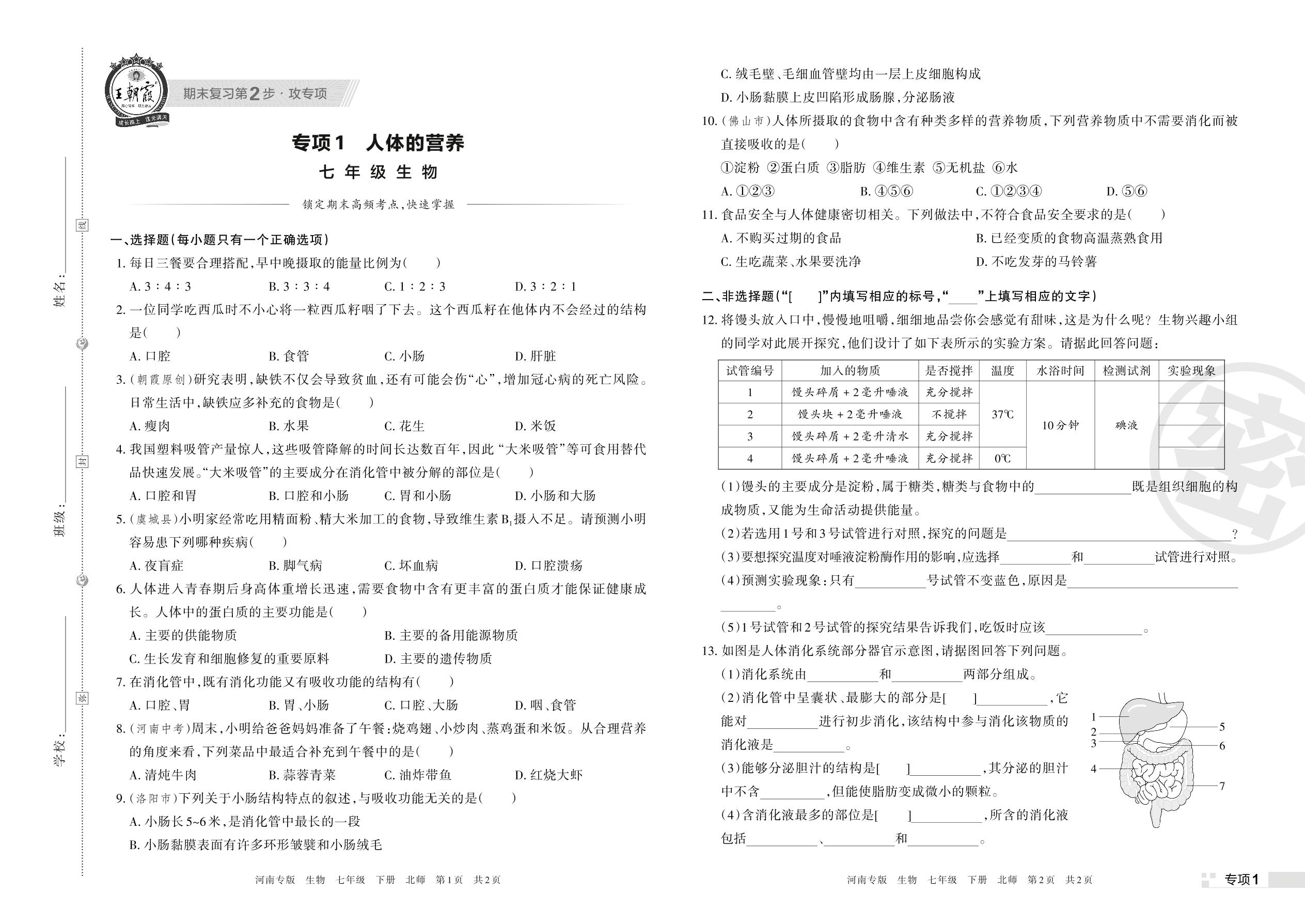 王朝霞期末专项卷——人体的营养七年级下册生物(北师版)【1】