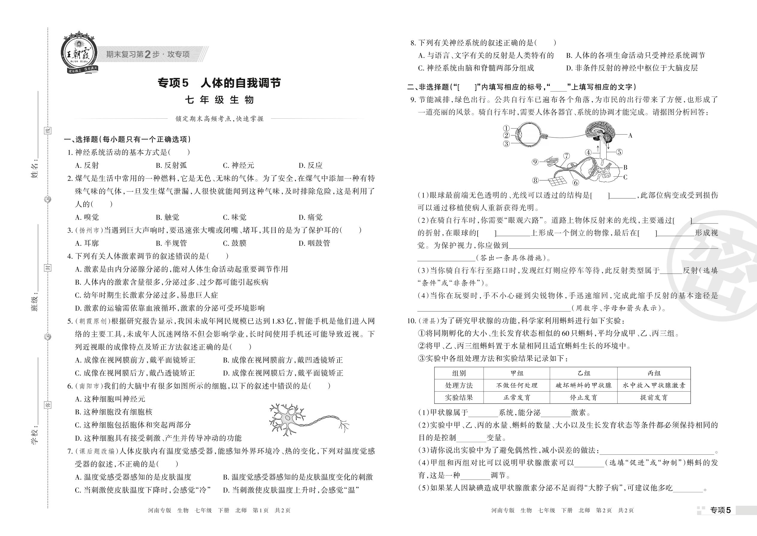 王朝霞期末专项卷——人体的自我调节七年级下册生物(北师版)【5】