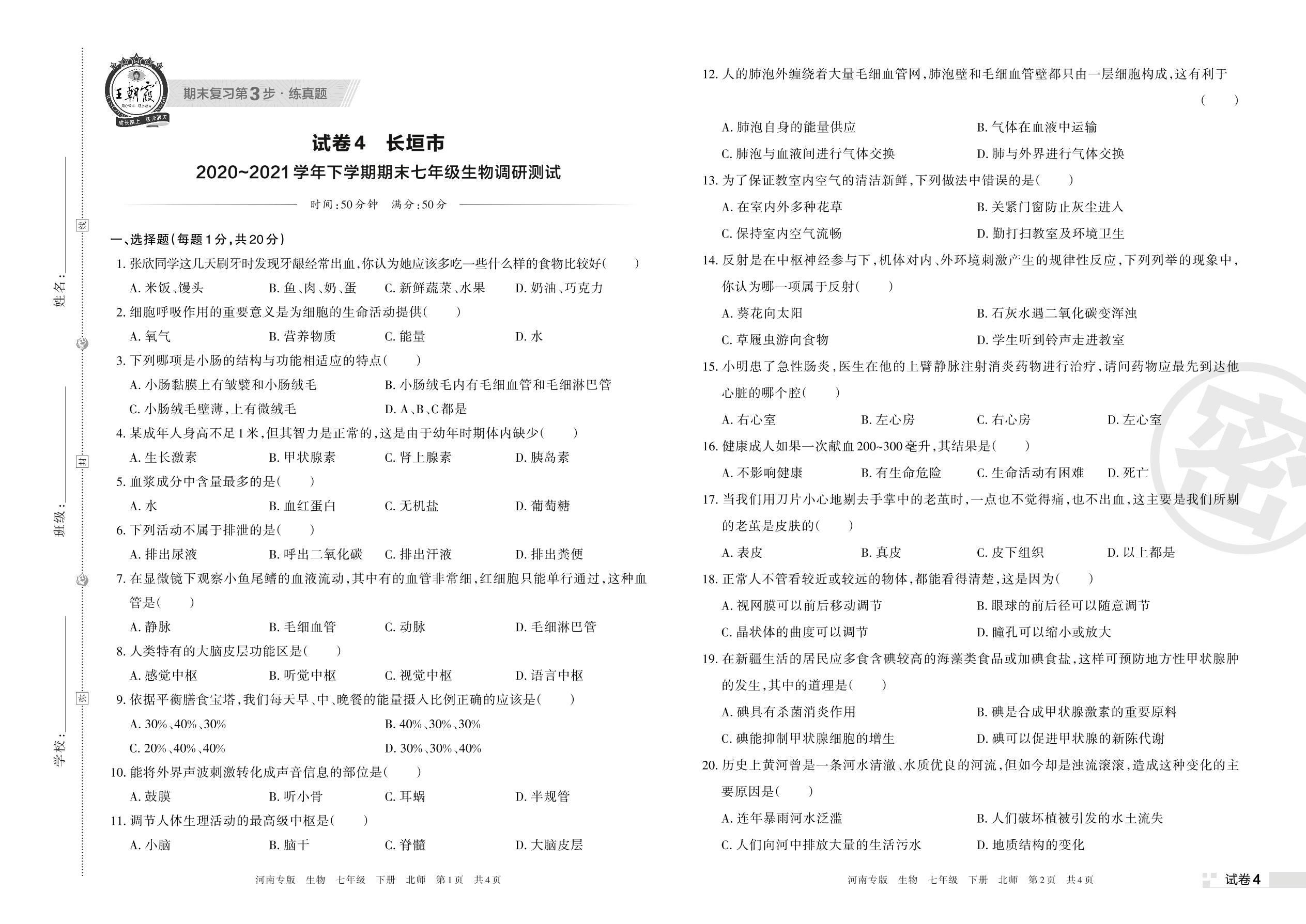 七年级生物北师版下册期末卷