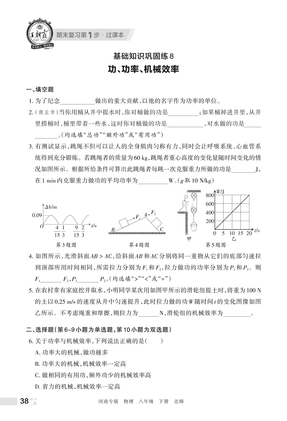 王朝霞期末过课本——基础知识巩固练8 功、功率、机械效率八年级下册物理(北师版)
