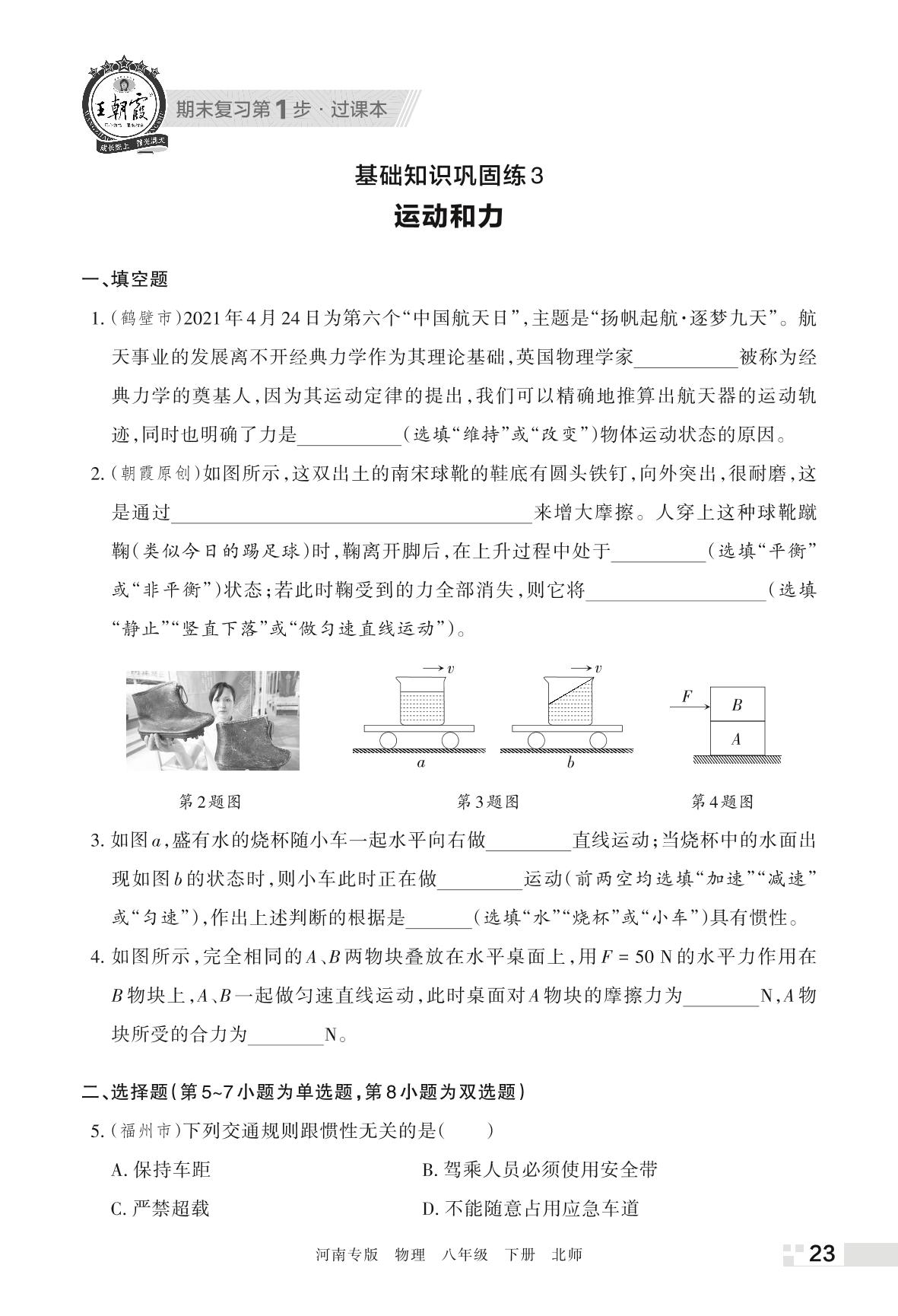 王朝霞期末过课本——基础知识巩固练3 运动和力八年级下册物理(北师版)