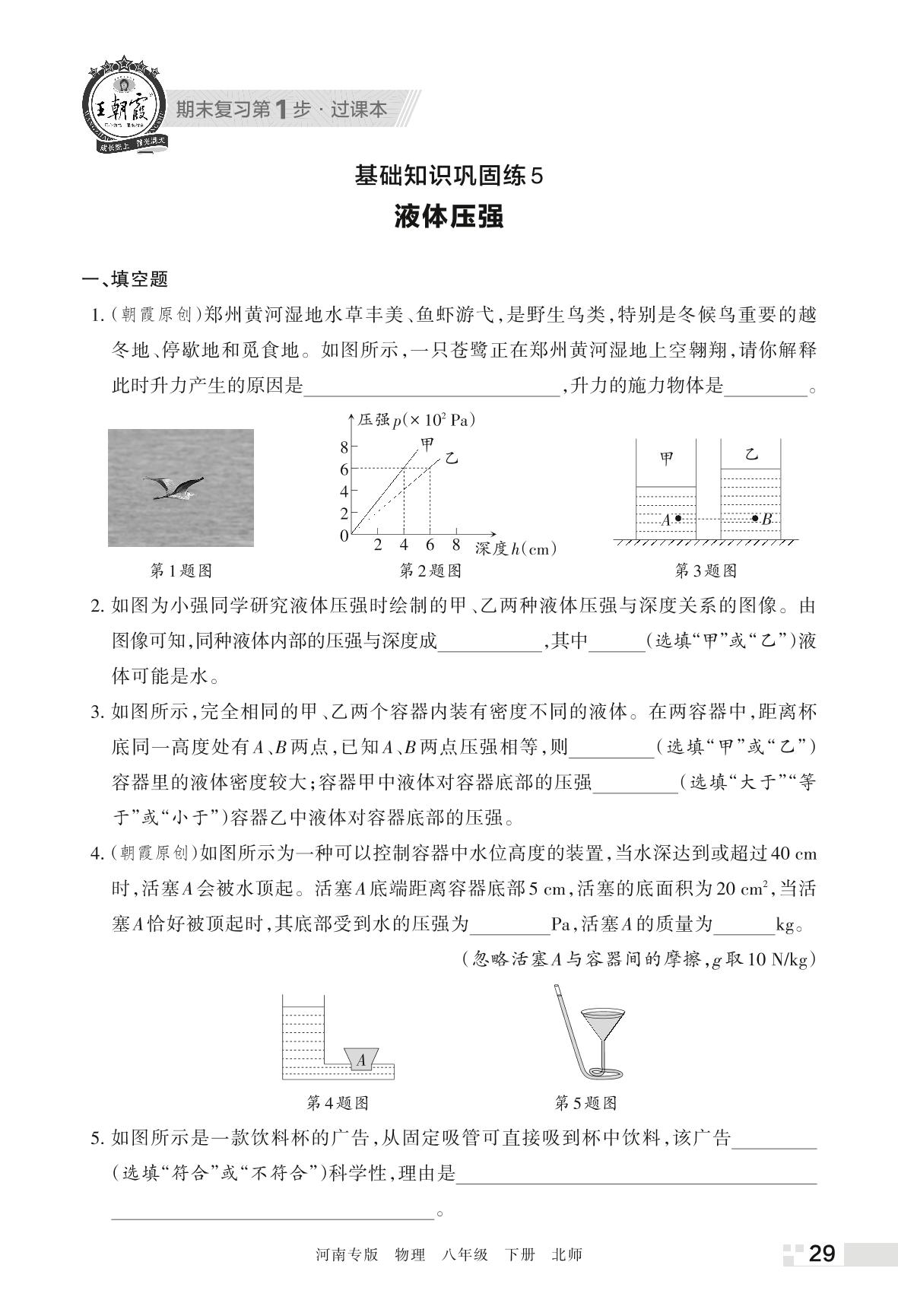 王朝霞期末过课本——基础知识巩固练5 液体压强八年级下册物理(北师版)