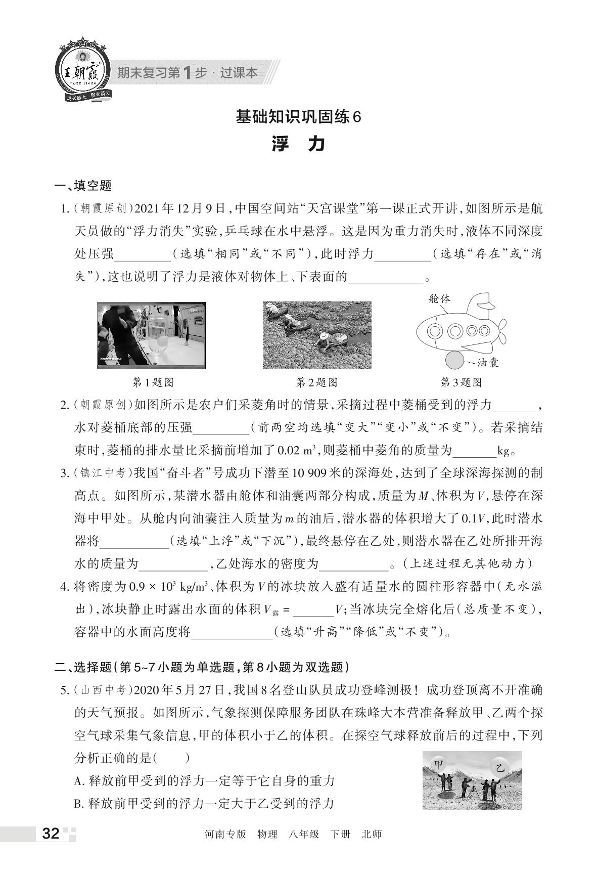 王朝霞期末过课本——基础知识巩固练6 浮力八年级下册物理(北师版)