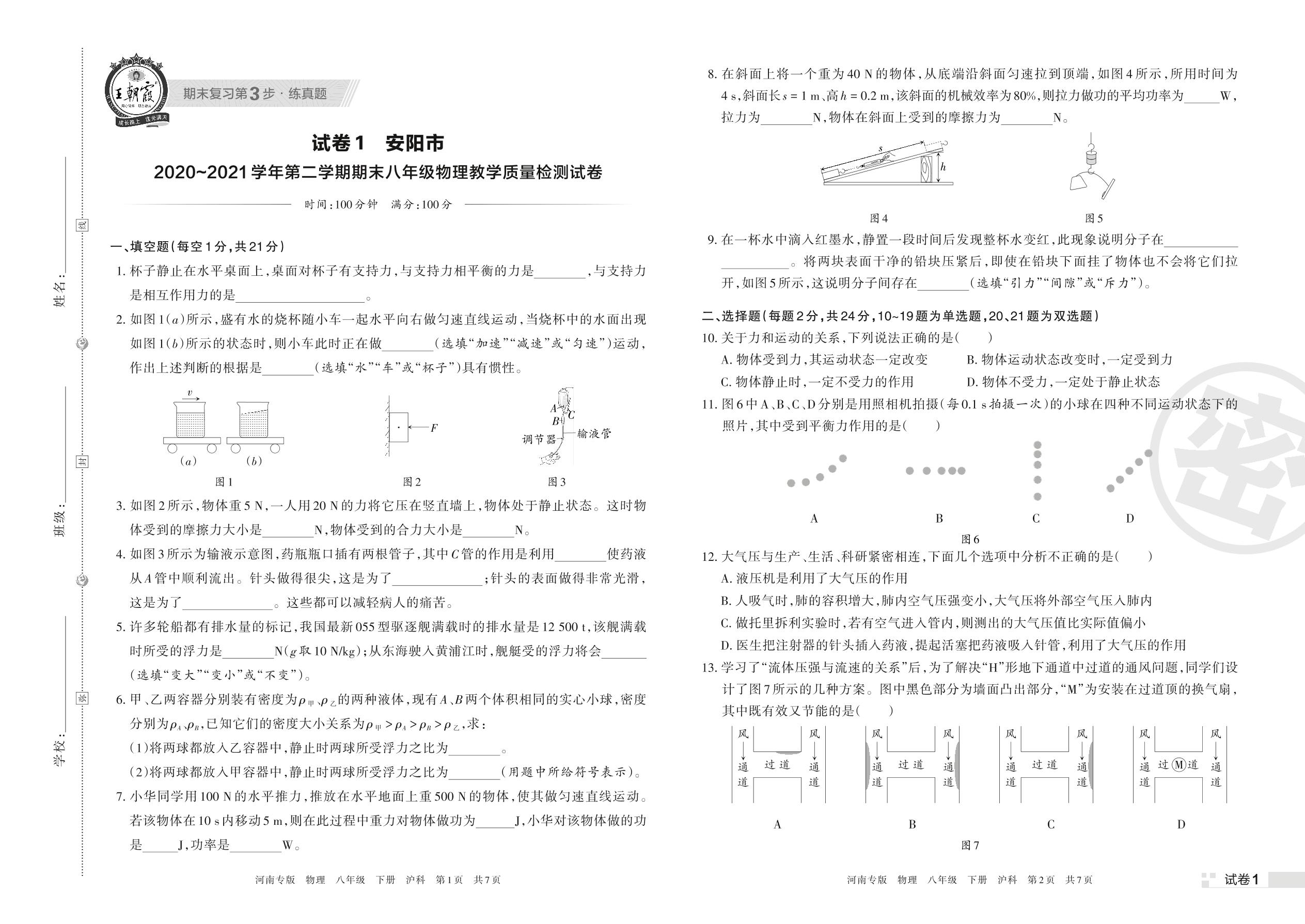 安阳市2020~2021学年第二学期期末八年级物理教学质量检测试卷(沪科版)【1】