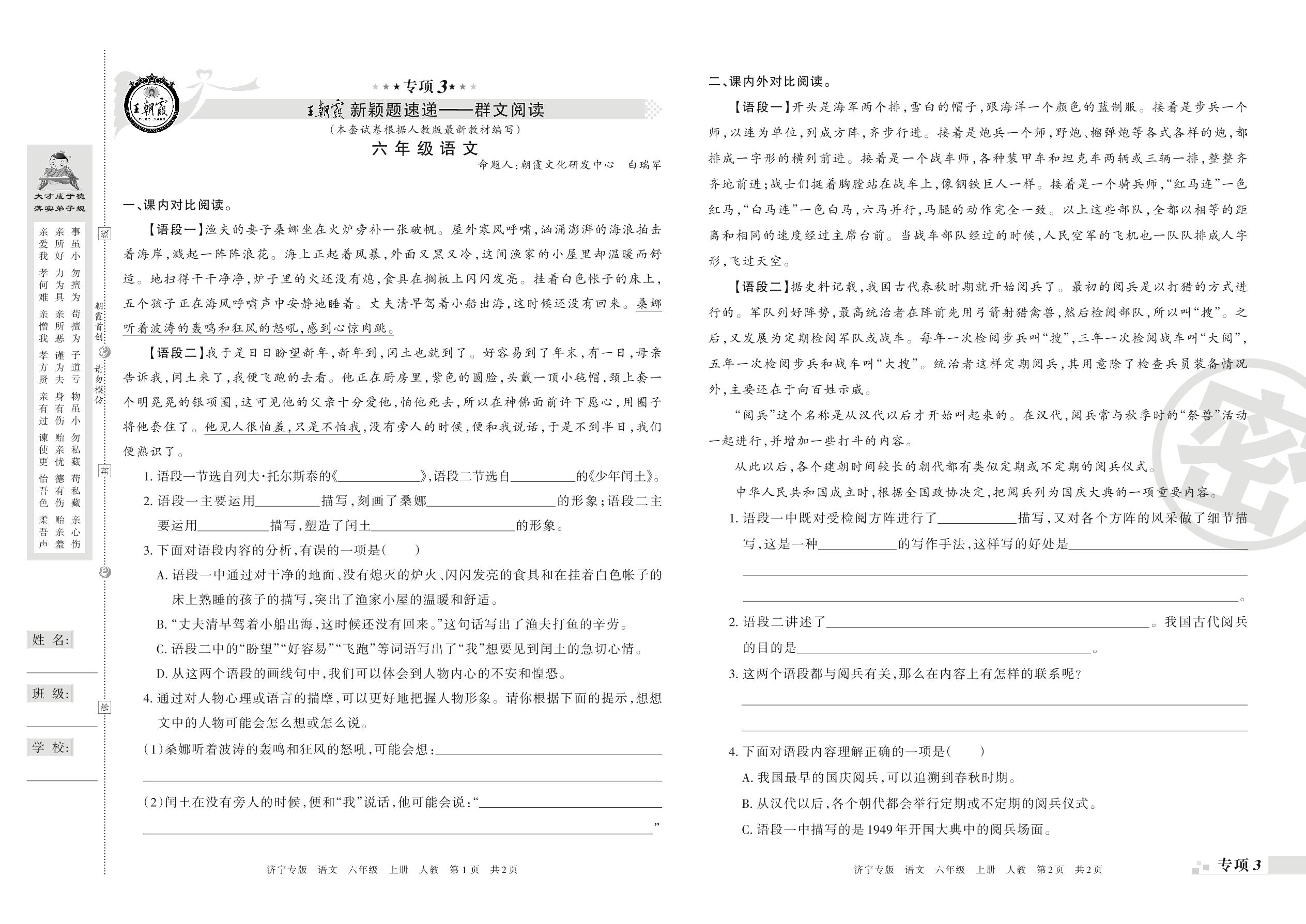 王朝霞期末专项卷——群文阅读、古诗文阅读六年级上册语文(人教版)_R21080212029【0】