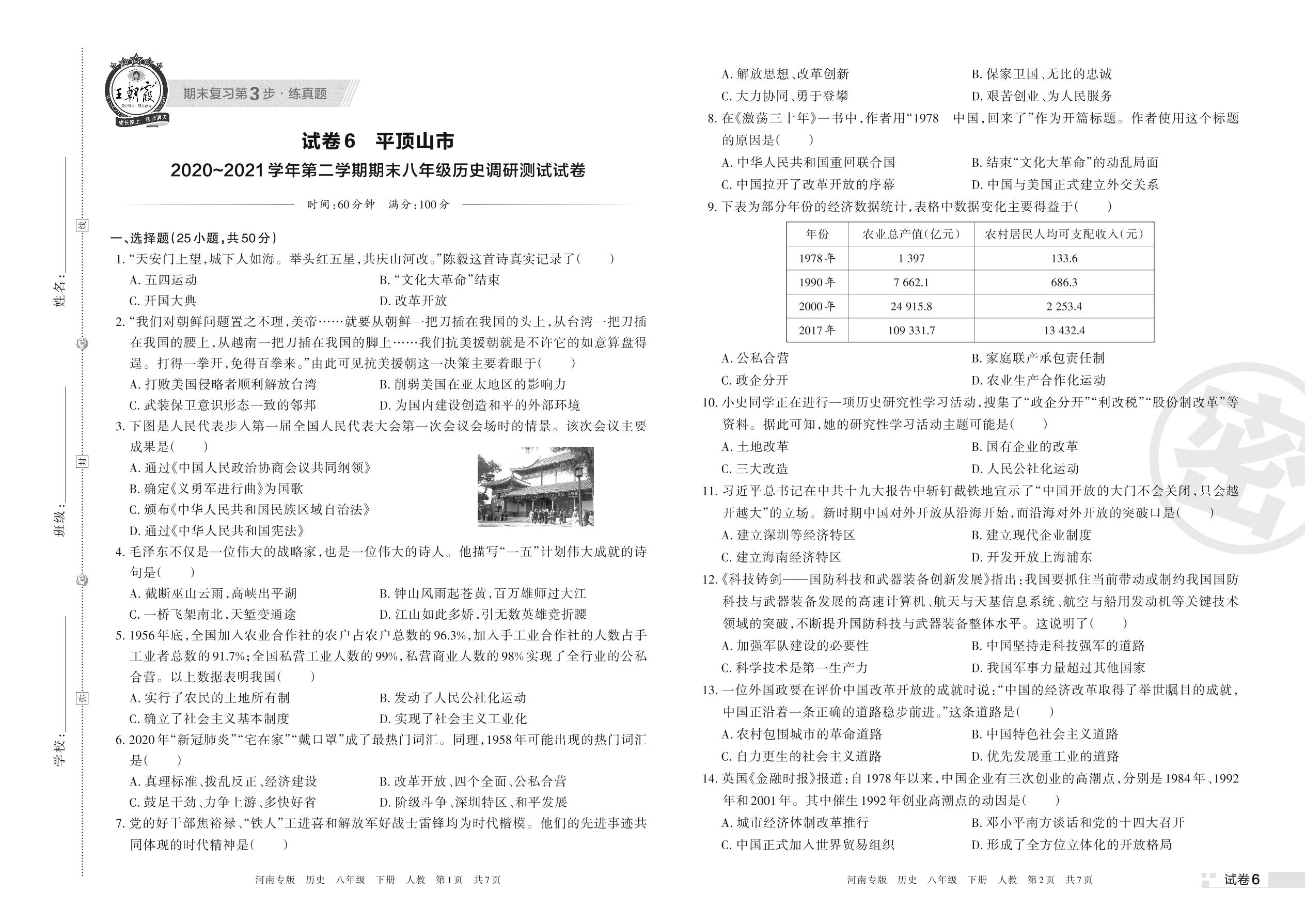 平顶山市2020~2021学年第二学期期末八年级历史调研测试试卷(人教版)【6】