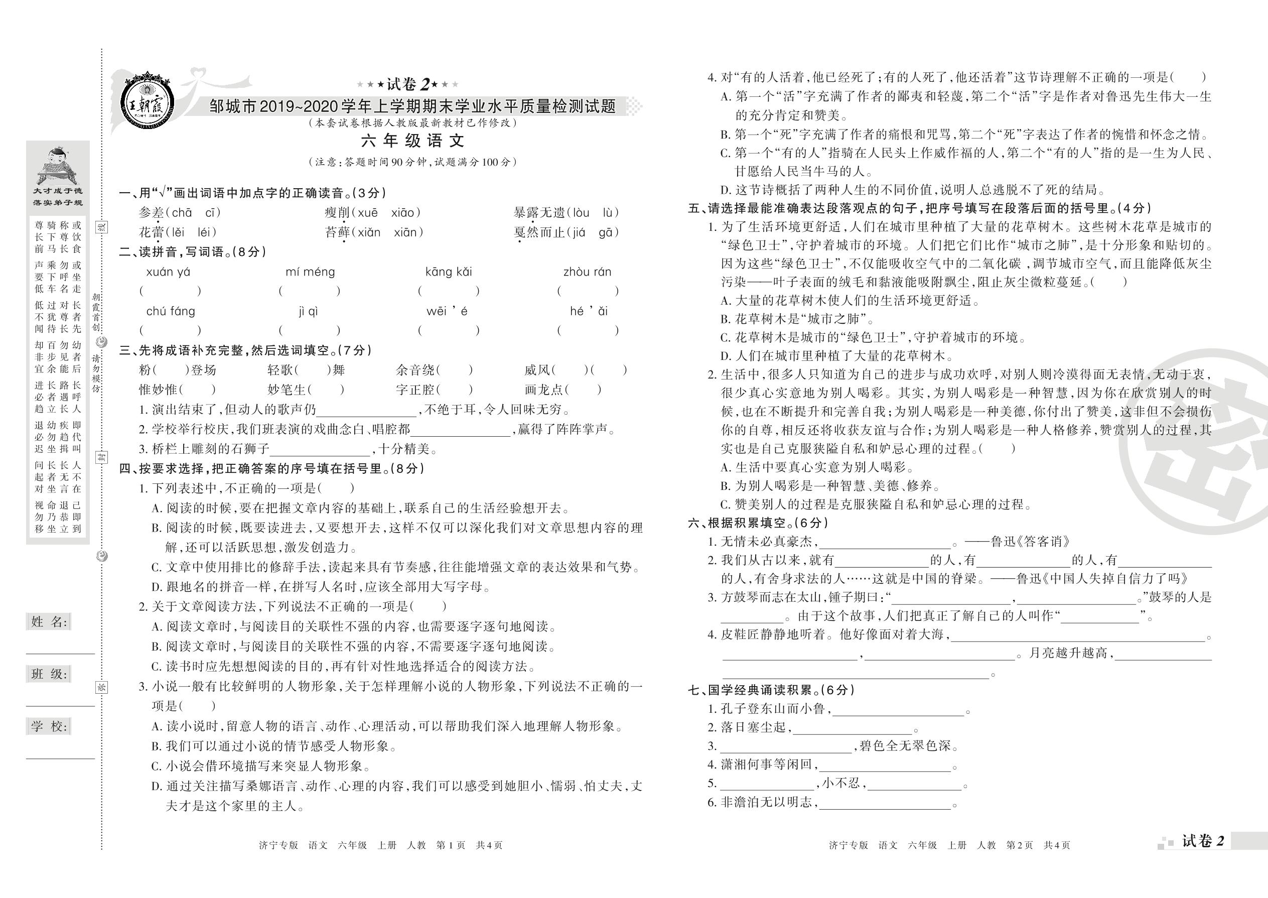 2019-2020学年第一学期邹城市六年级语文试卷(人教版)【2】