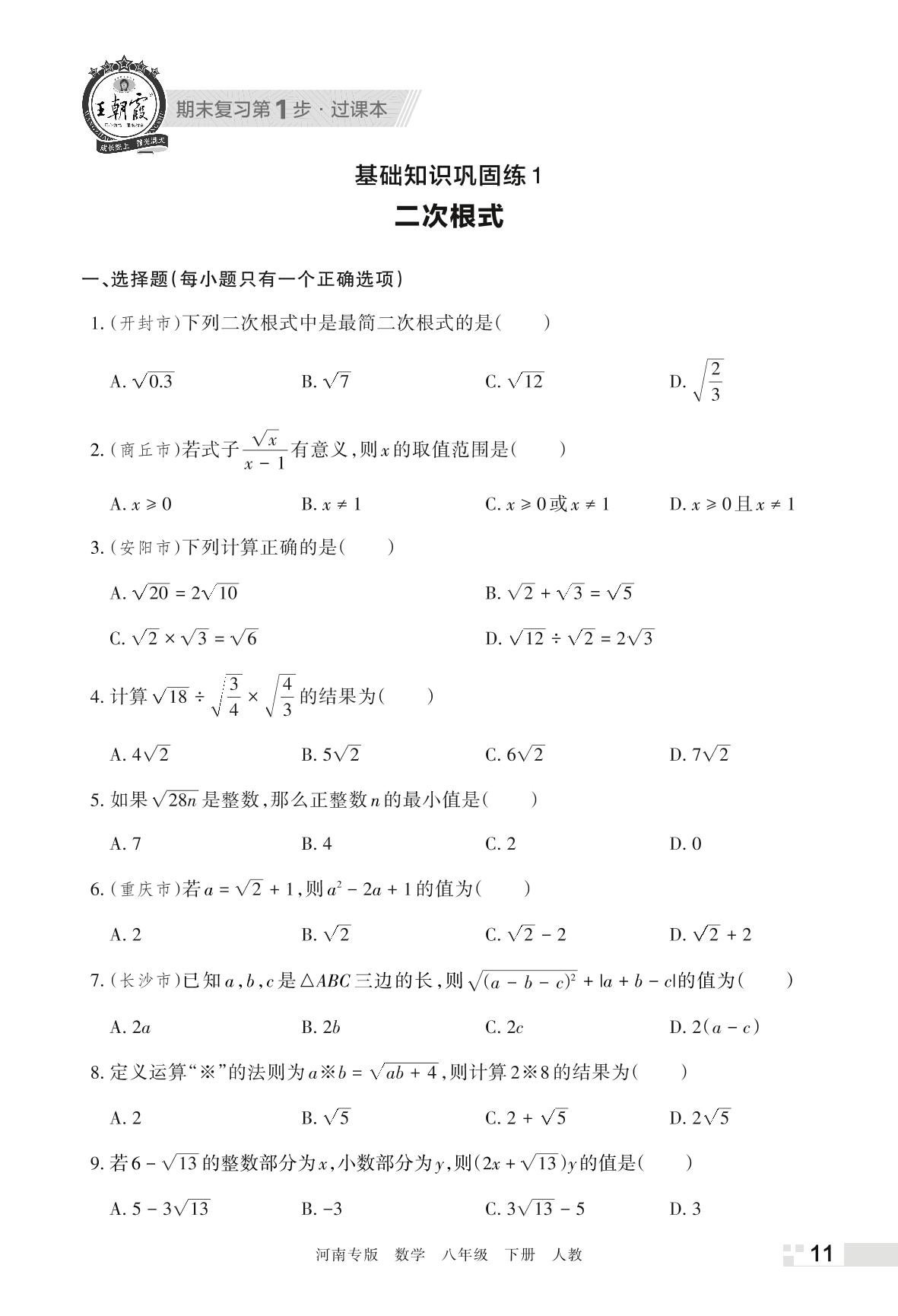 王朝霞期末过课本——基础知识巩固练1 二次根式八年级下册数学(人教版)_R220323135412761
