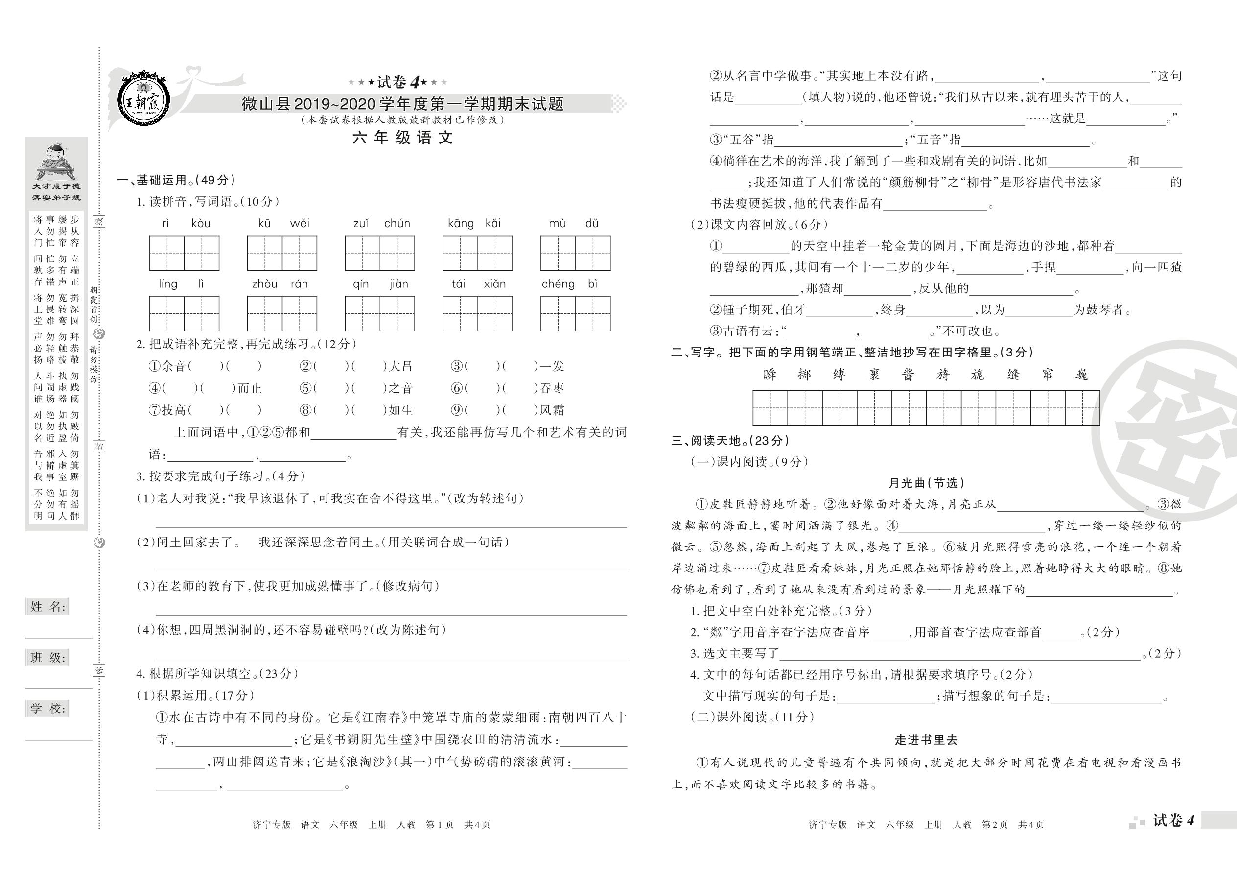 2019-2020学年第一学期济宁市微山县六年级语文试卷(人教版)【4】