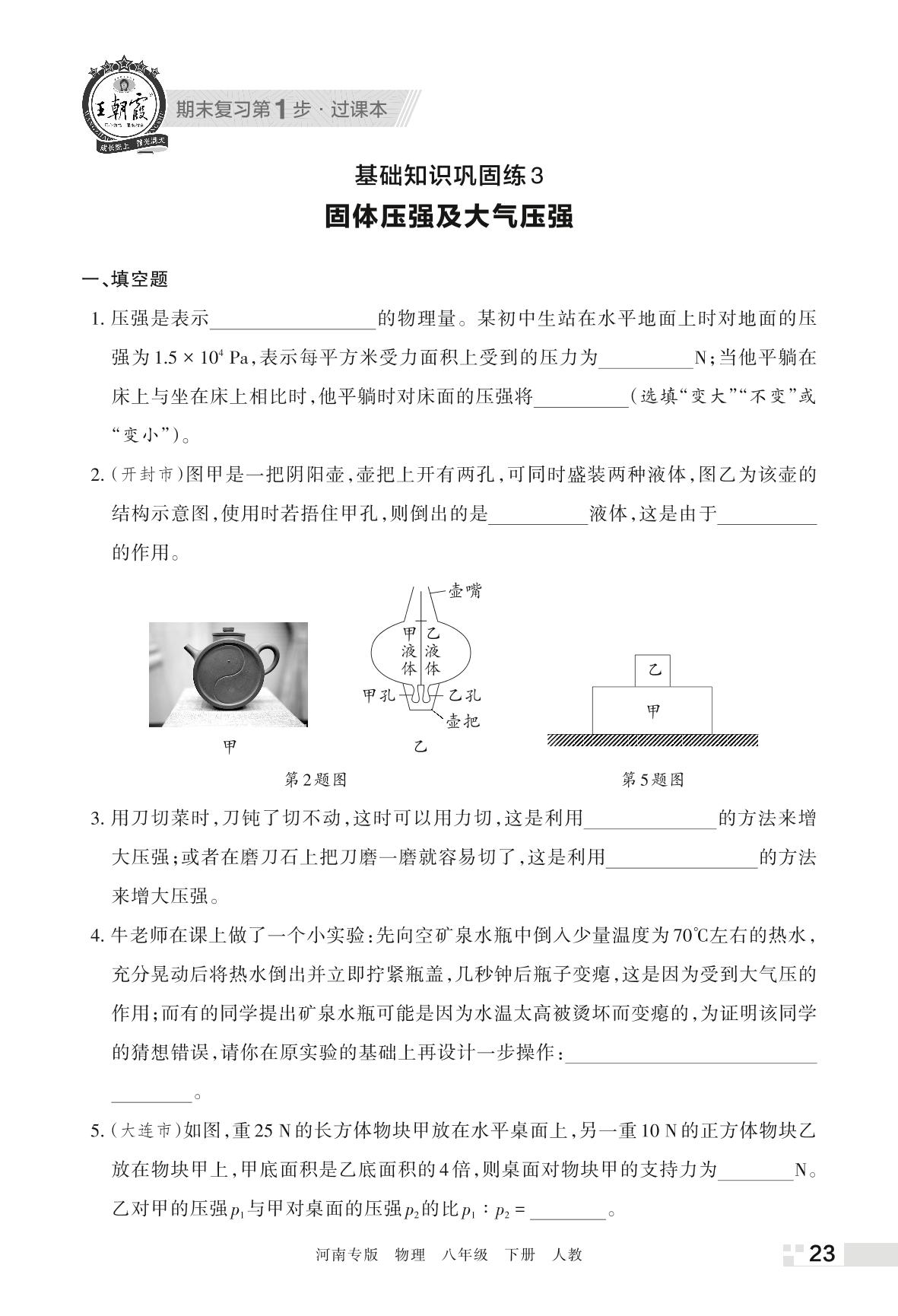 王朝霞期末过课本——基础知识巩固练3 固体压强及大气压强八年级下册物理(人教版)_R220323140210856