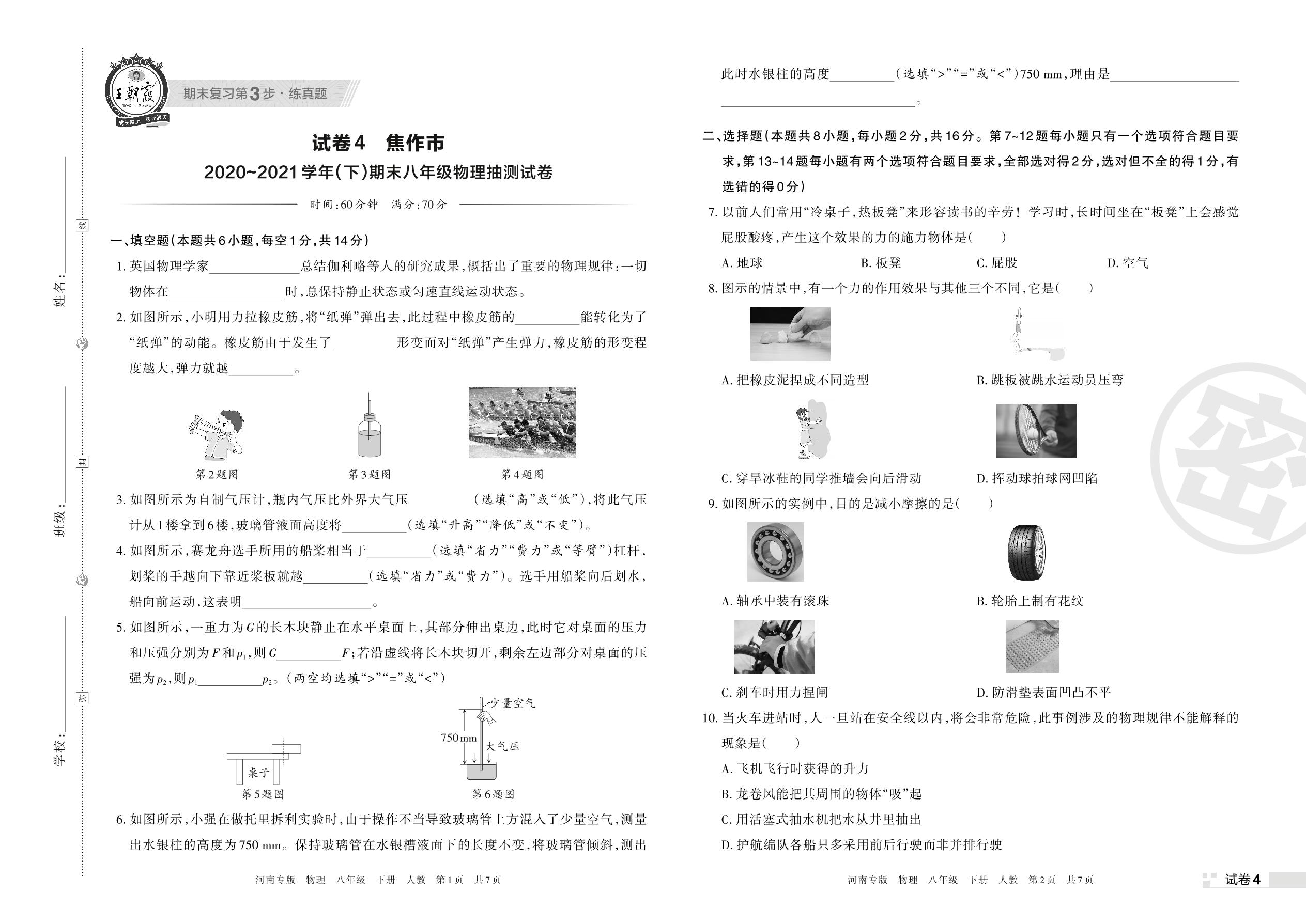 焦作市2020~2021学年(下)期末八年级物理抽测试卷(人教版)【4】