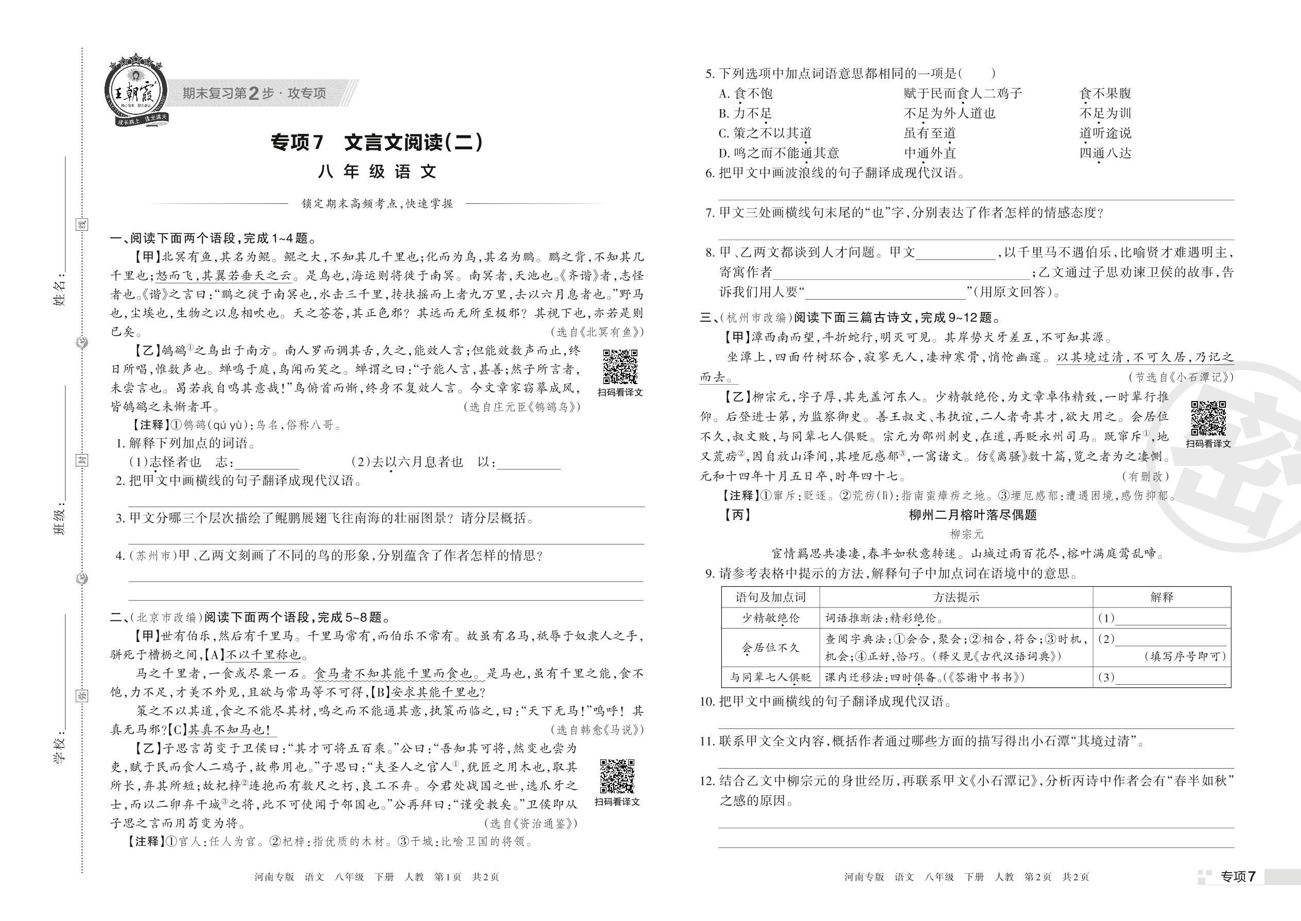 王朝霞期末专项卷——文言文阅读(二)八年级下册语文(人教版)【7】
