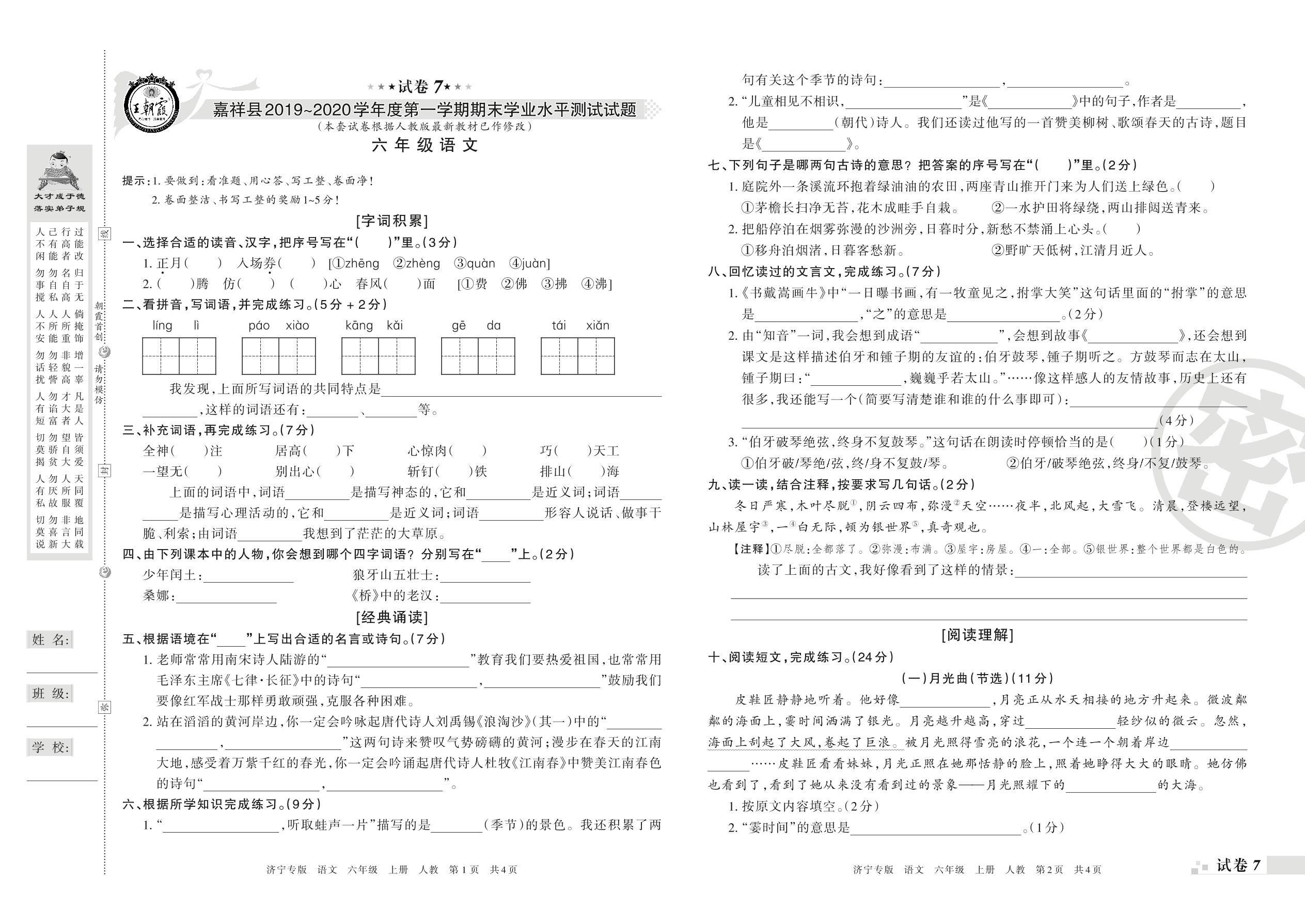 2019-2020学年第一学期济宁市嘉祥县六年级语文试卷(人教版)【7】