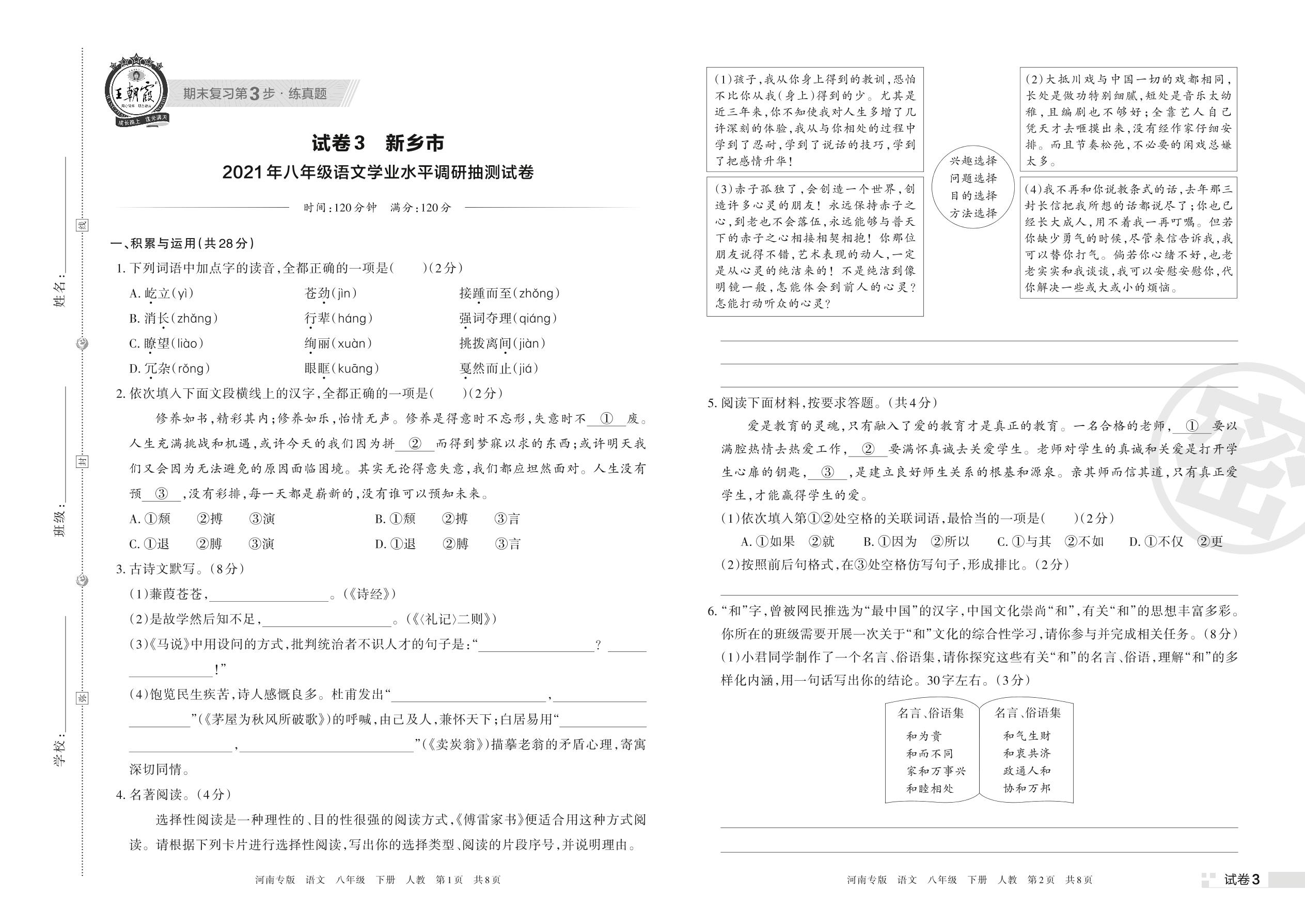 新乡市2021年八年级语文学业水平调研抽测试卷(人教版)【3】