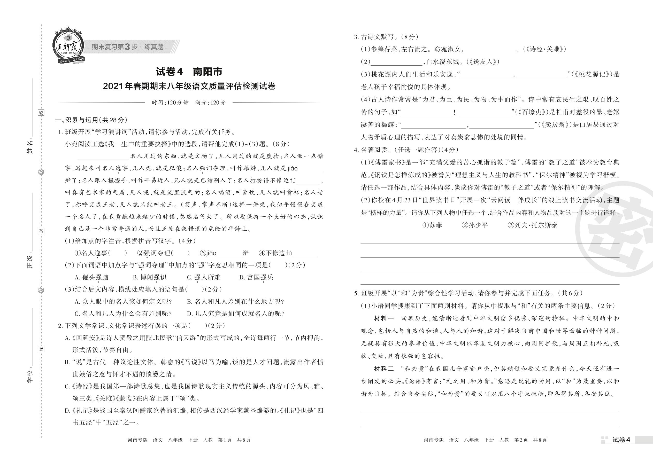 南阳市2021年春期期末八年级语文质量评估检测试卷(人教版)【4】