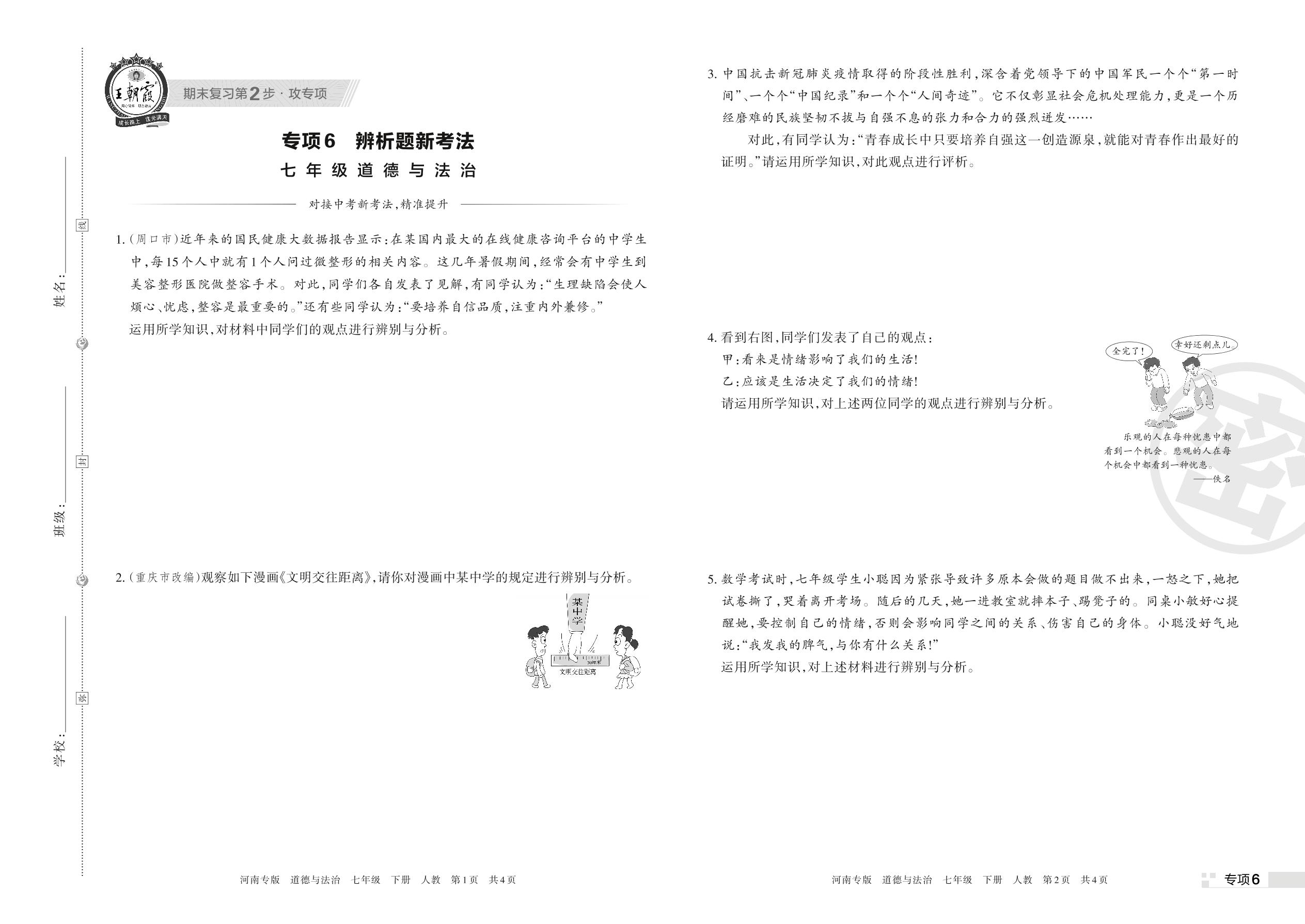 王朝霞期末专项卷——辨析题新考法七年级下册道德与法治(人教版)【6】