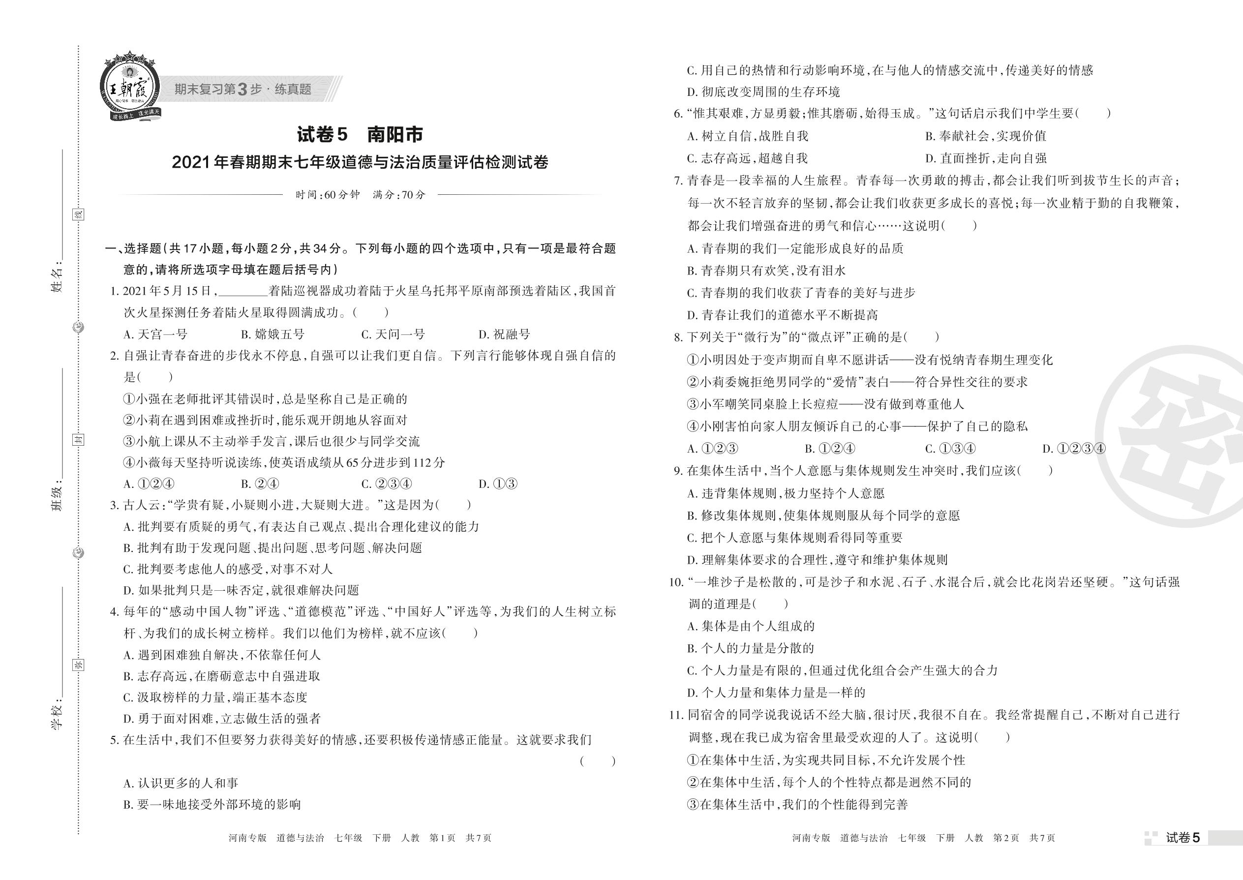 南阳市2021年春期期末七年级道德与法治质量评估检测试卷(人教版)【5】