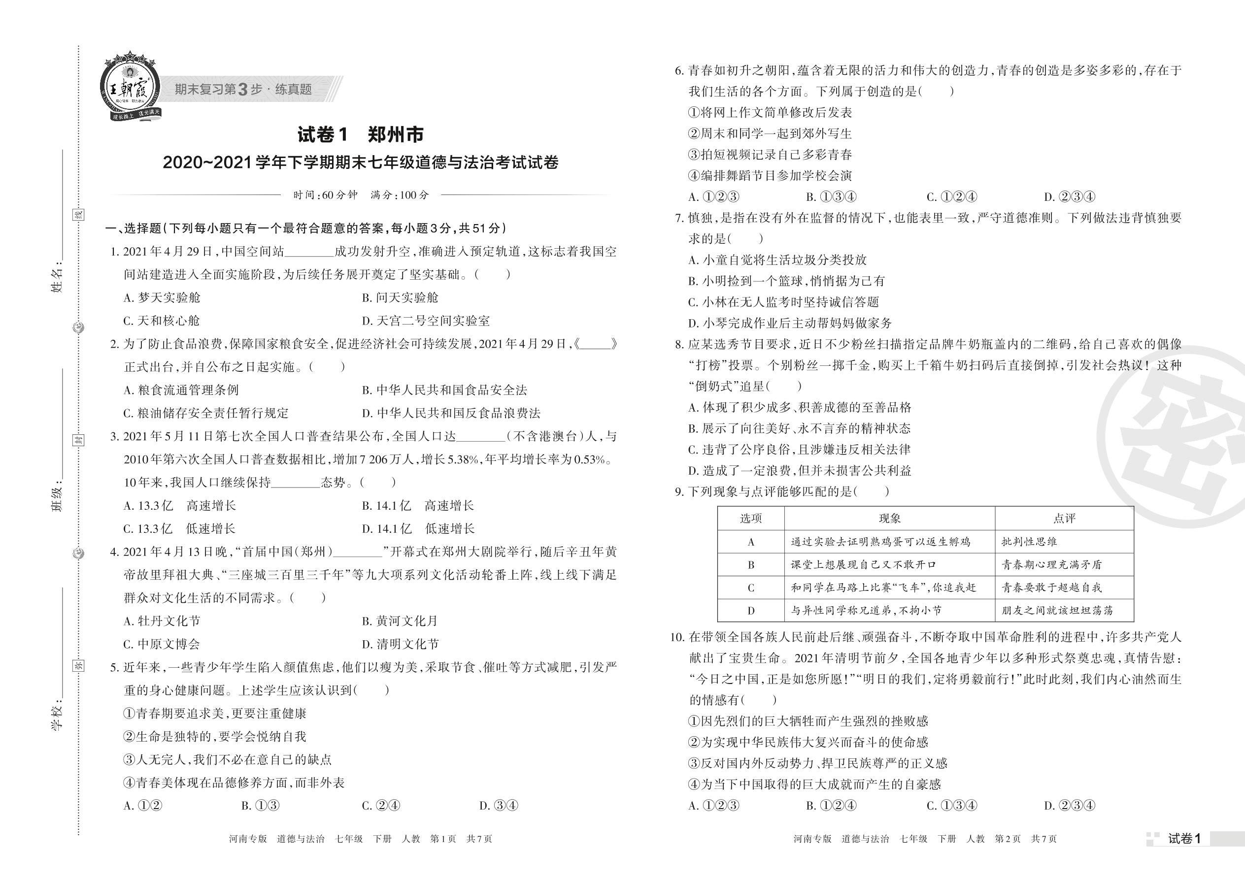 郑州市2020~2021学年下学期期末七年级道德与法治考试试卷(人教版)【1】