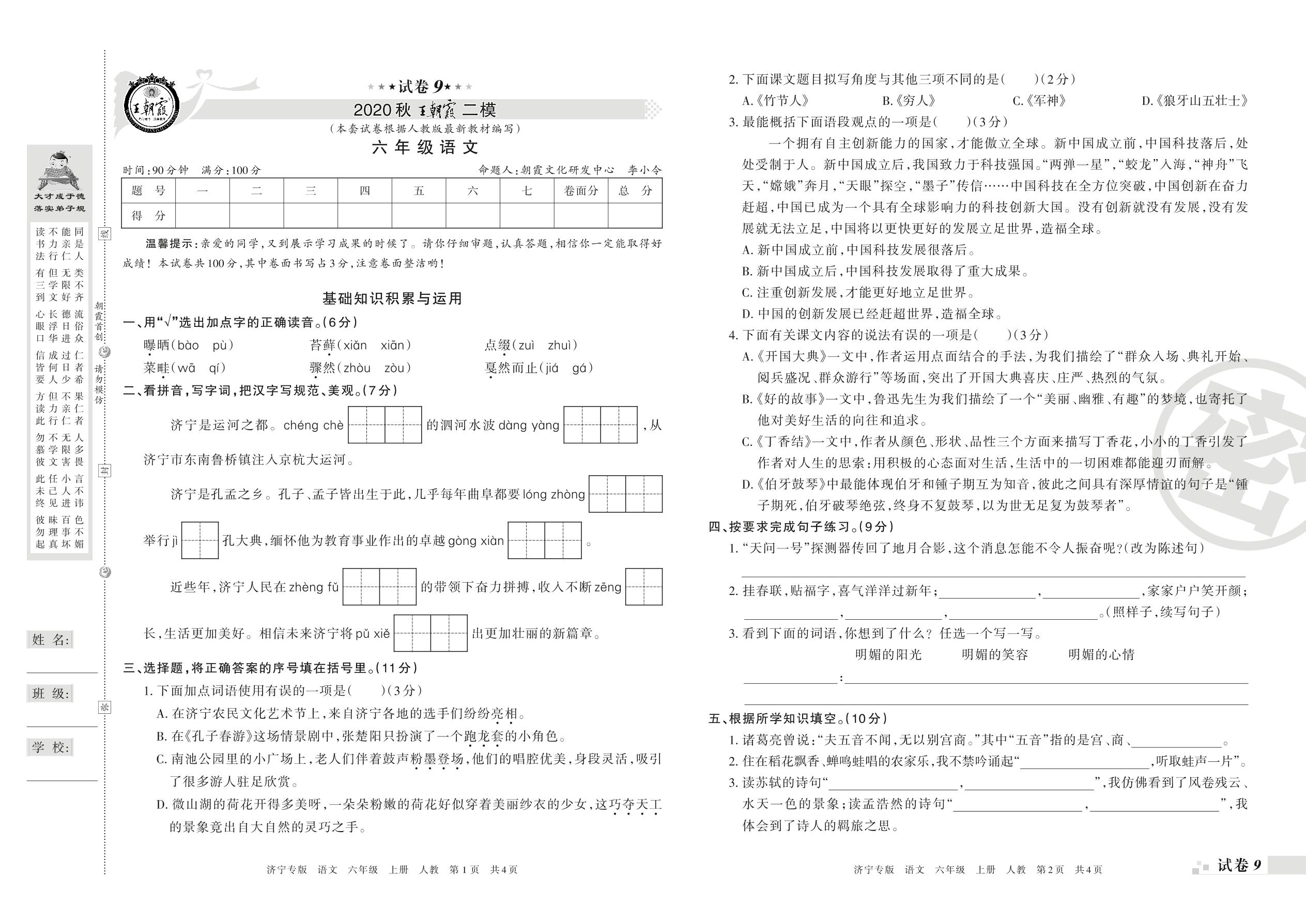 王朝霞期末模拟卷六年级上册语文(人教版)_R21080212111【9】