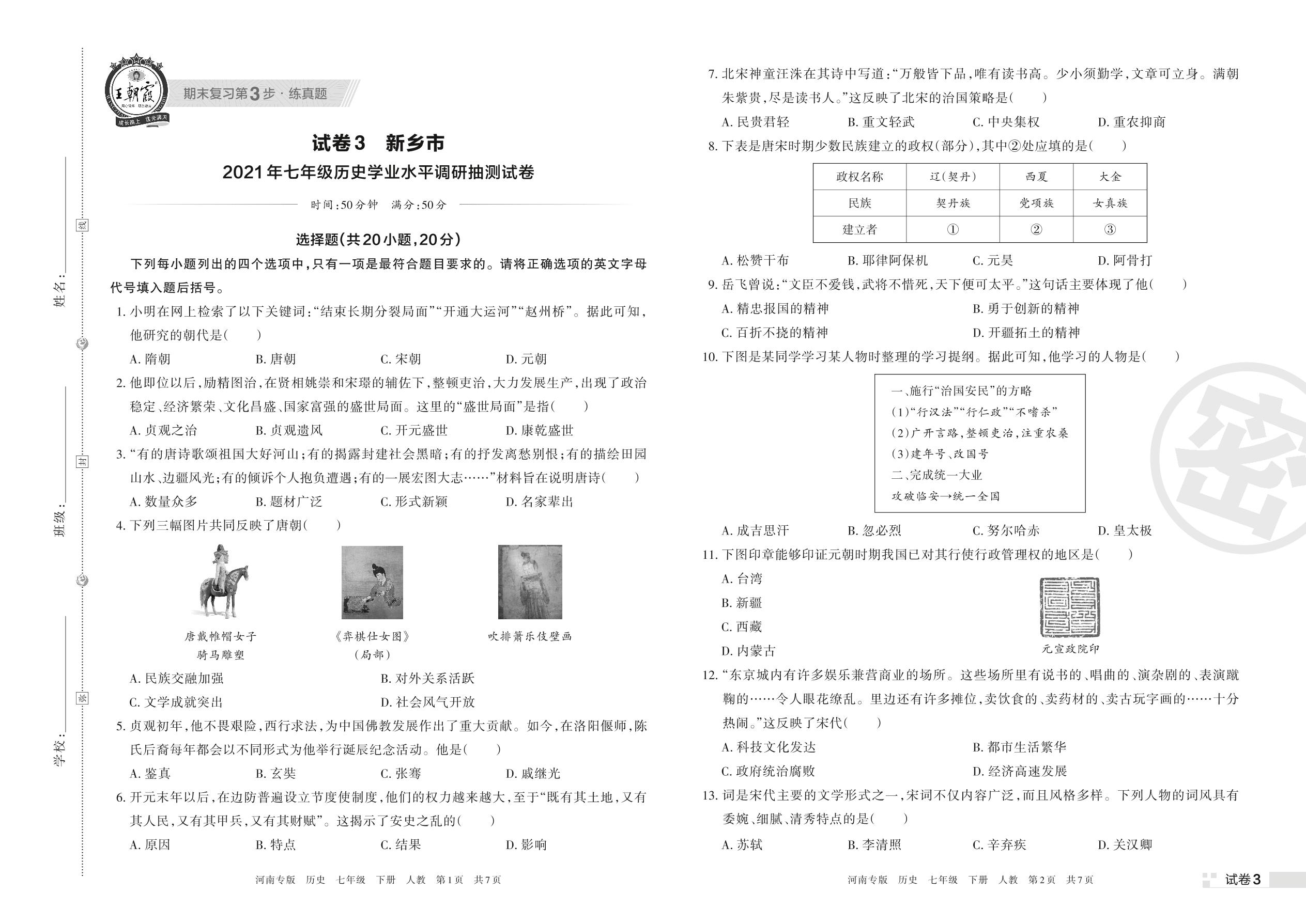 新乡市2021年七年级历史学业水平调研抽测试卷(人教版)【3】