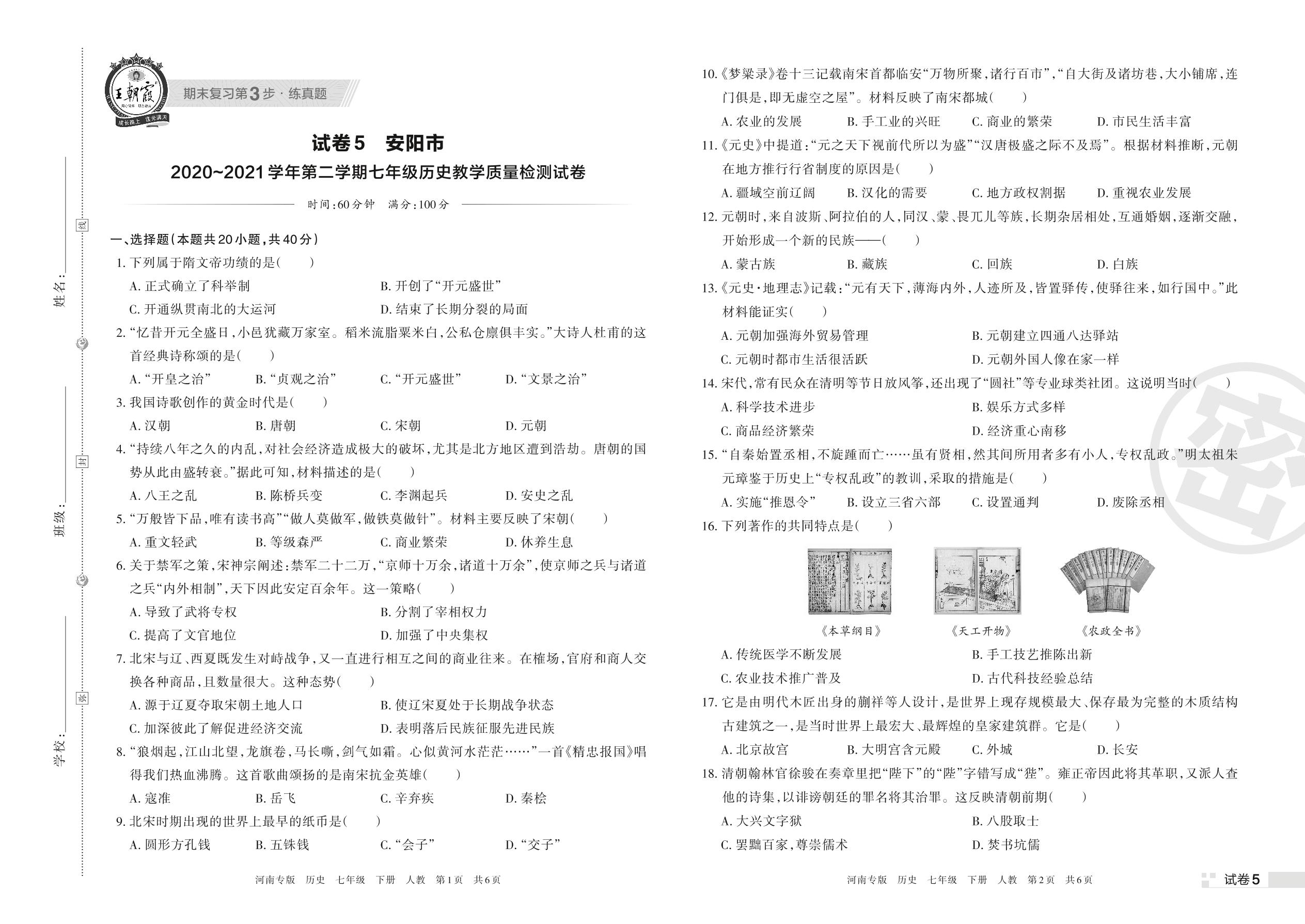 安阳市2020~2021学年第二学期七年级历史教学质量检测试卷(人教版)【5】
