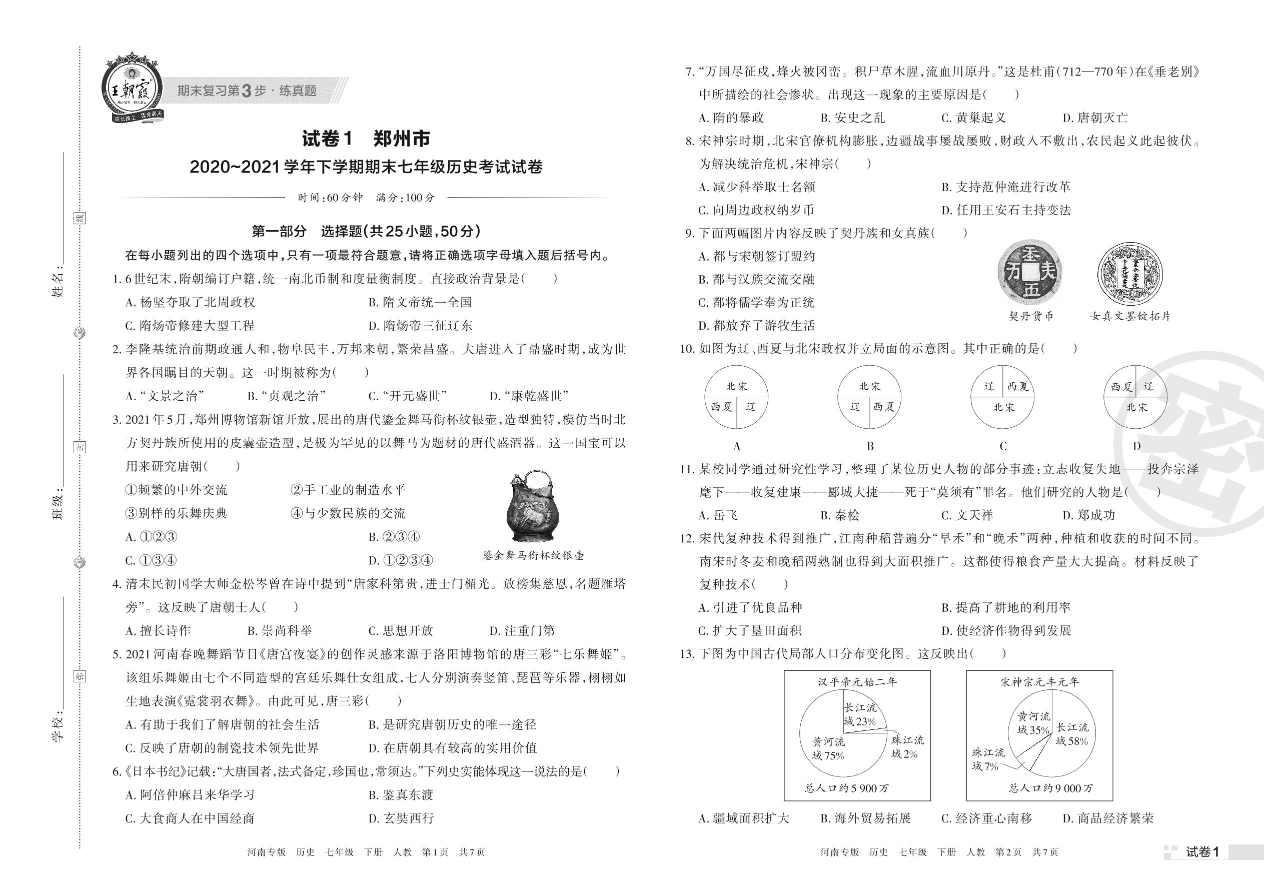 郑州市2020~2021学年下学期期末七年级历史考试试卷(人教版)【1】