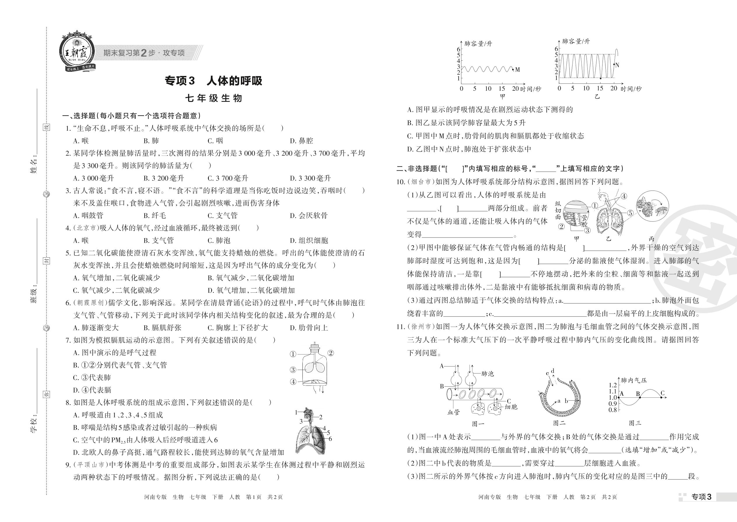 王朝霞期末专项卷——人体的呼吸七年级下册生物(人教版)【3】