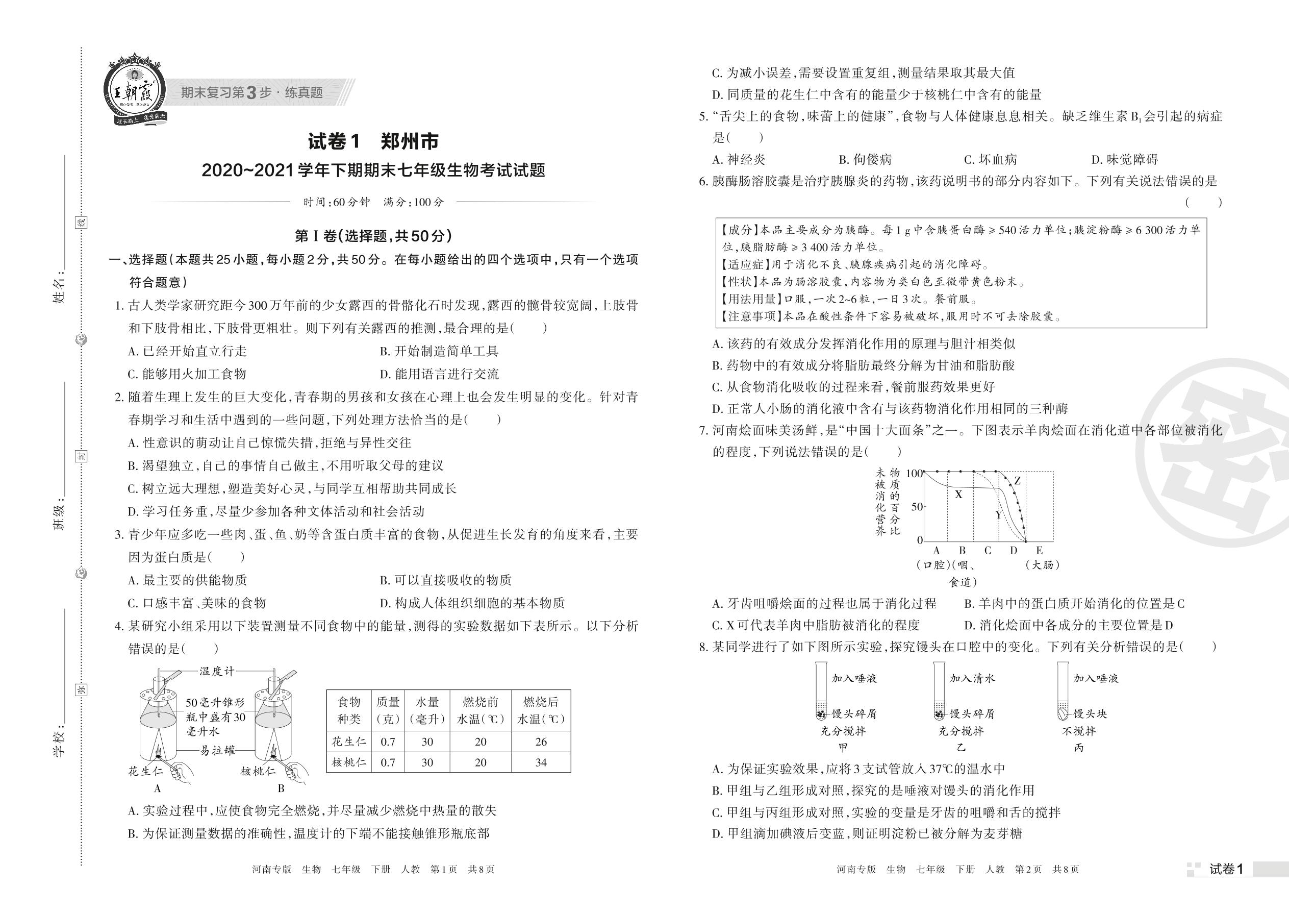 郑州市2020~2021学年下期期末七年级生物考试试题(人教版)【1】